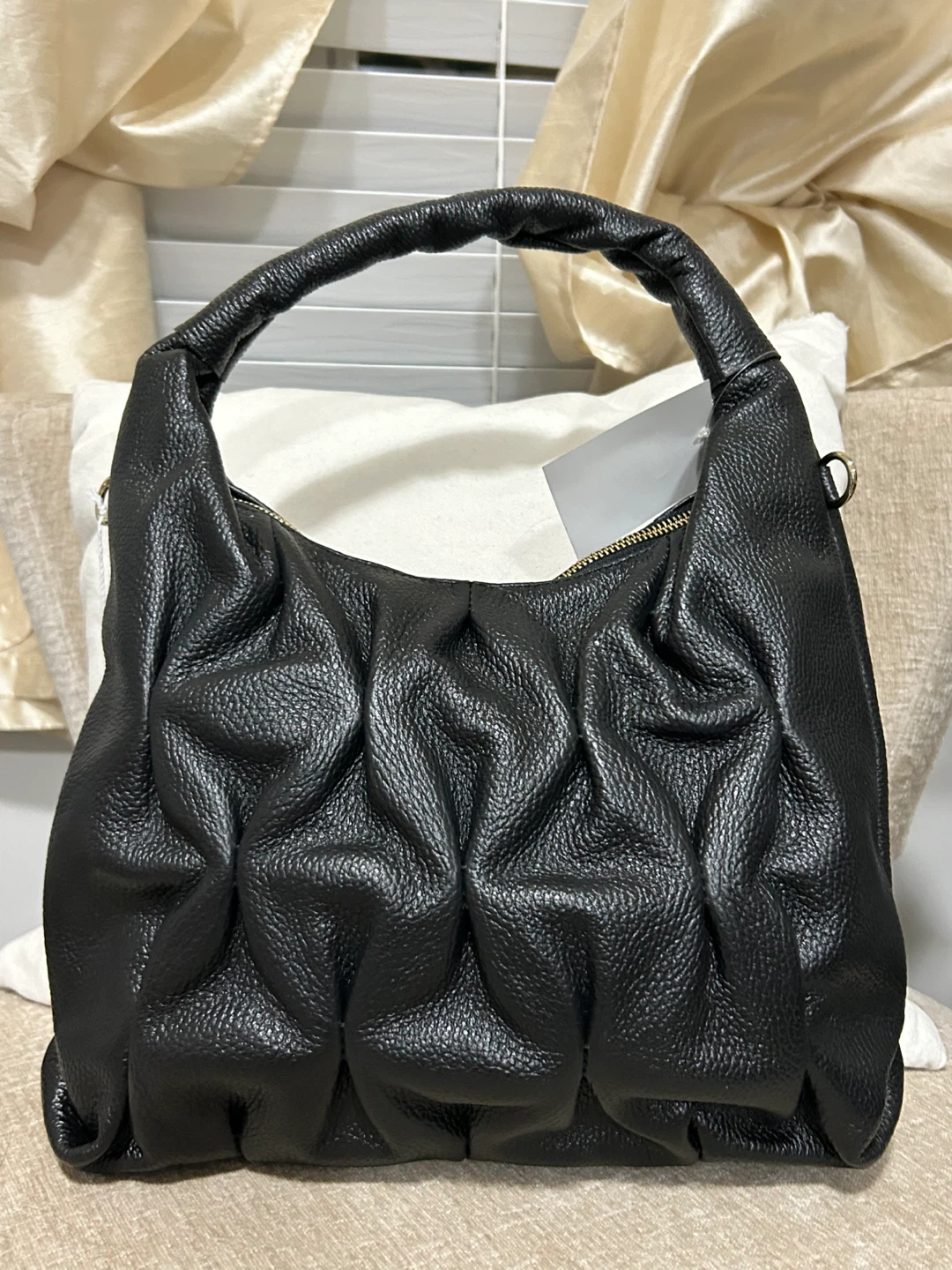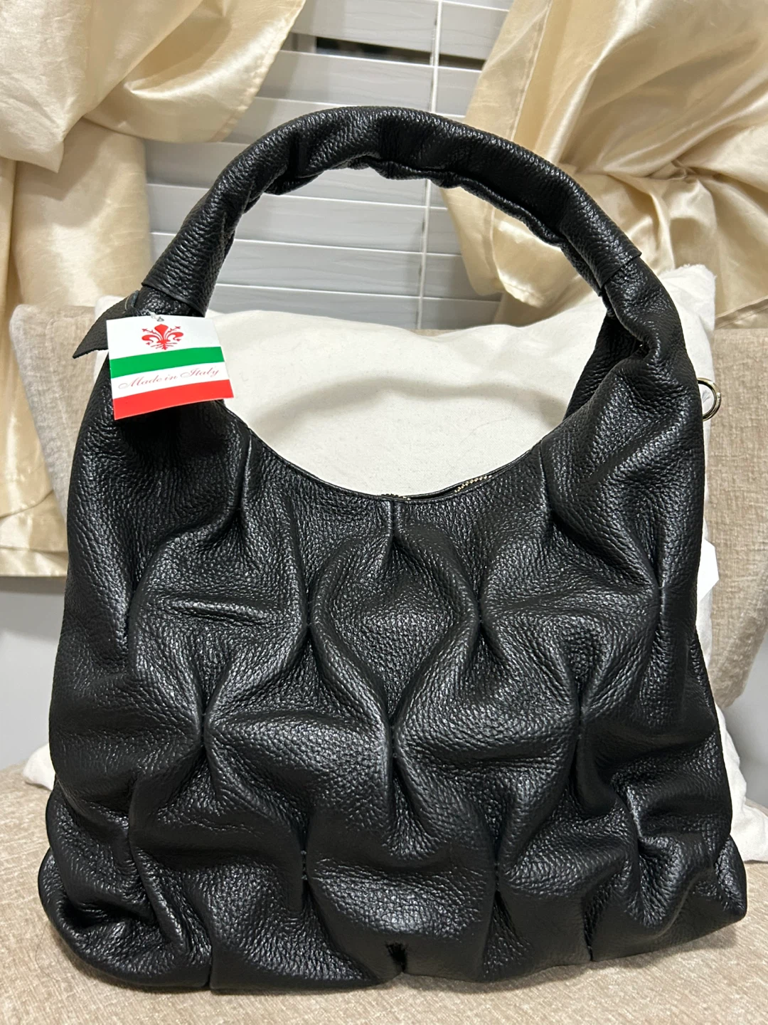 Selling a stylish black leather handbag that was made in Italy. It's in great condition and features a unique, gathered design. Perfect for adding a touch of Italian flair to your wardrobe!