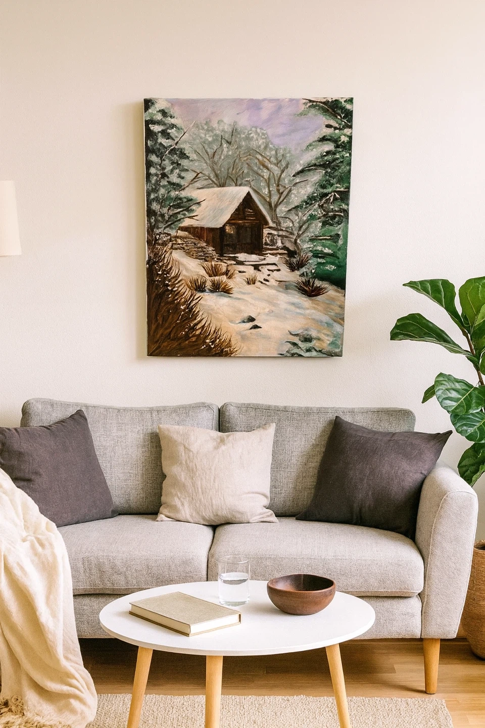 This piece features a peaceful snowy scene that adds calm, beauty, and a cozy winter vibe to any room.