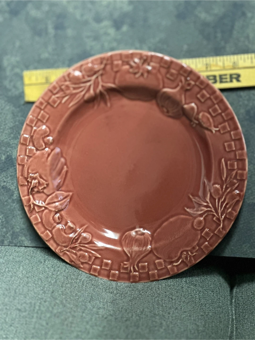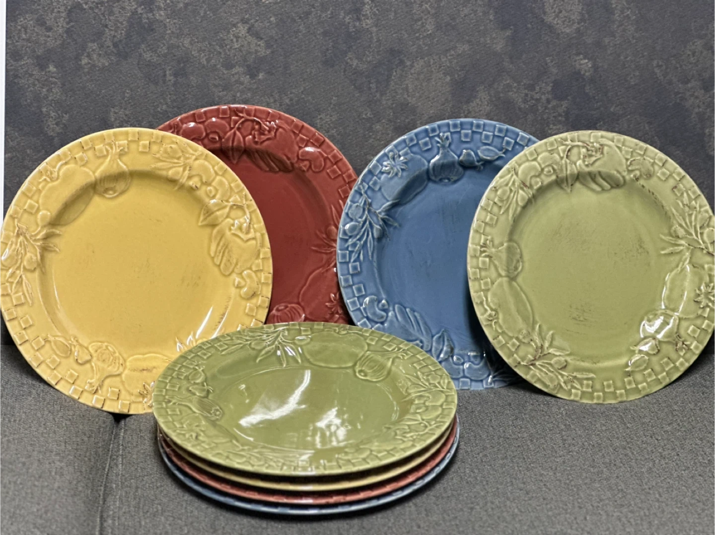 Selling a set of 8 Home Trends plates. They feature a lovely embossed design with various fruits and leaves around the rim. The set includes plates in yellow, red, blue, and green. Perfect for adding a touch of charm to your table!