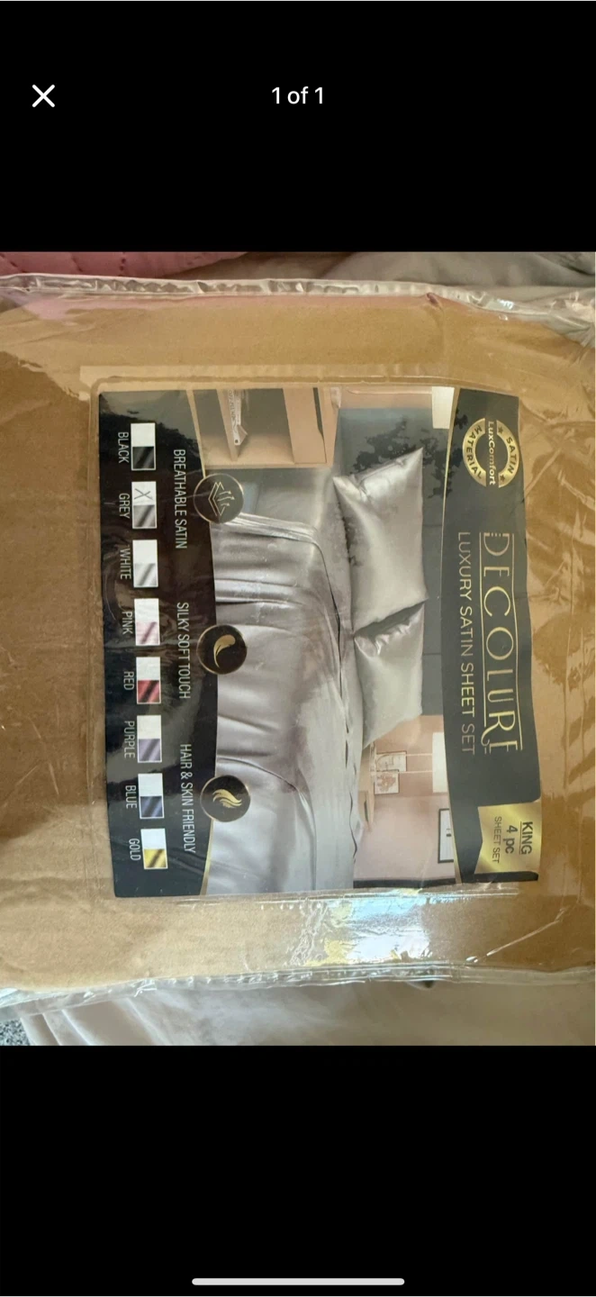 I'm selling a brand new Decolure Luxury Satin Sheet Set! It's a King size, 4-piece set in a lovely grey colour. These sheets are breathable, silky soft to the touch, and hair & skin friendly! Comes in the original packaging.