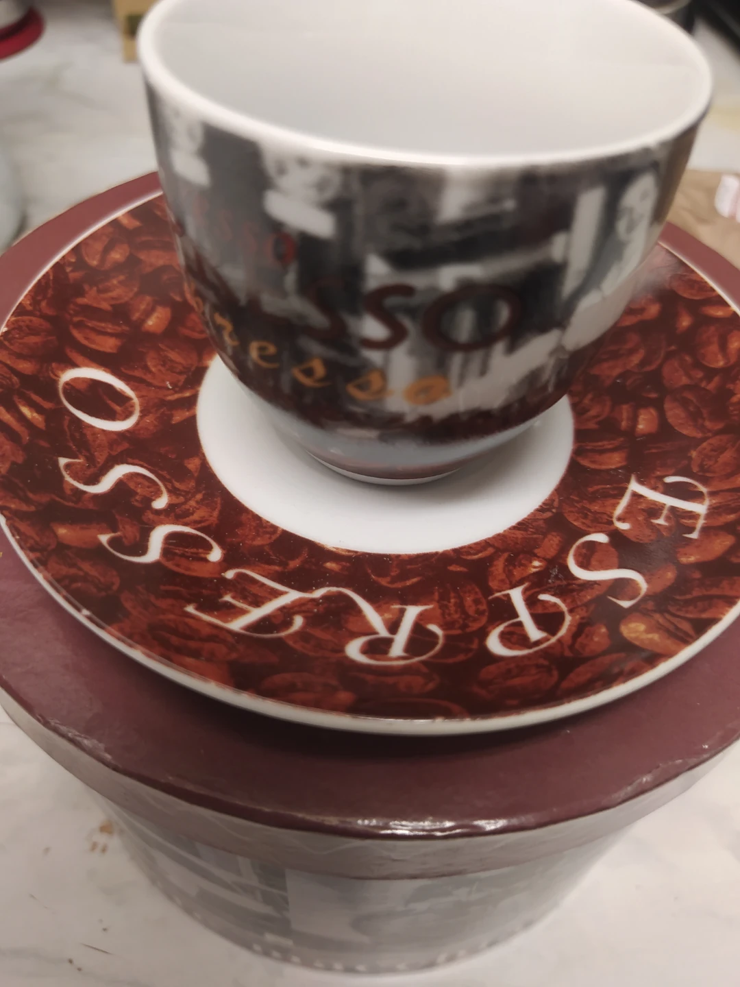 Selling a cute espresso cup set! The cups have a unique design with espresso written on them. Comes with a saucer and a box. Perfect for coffee lovers!