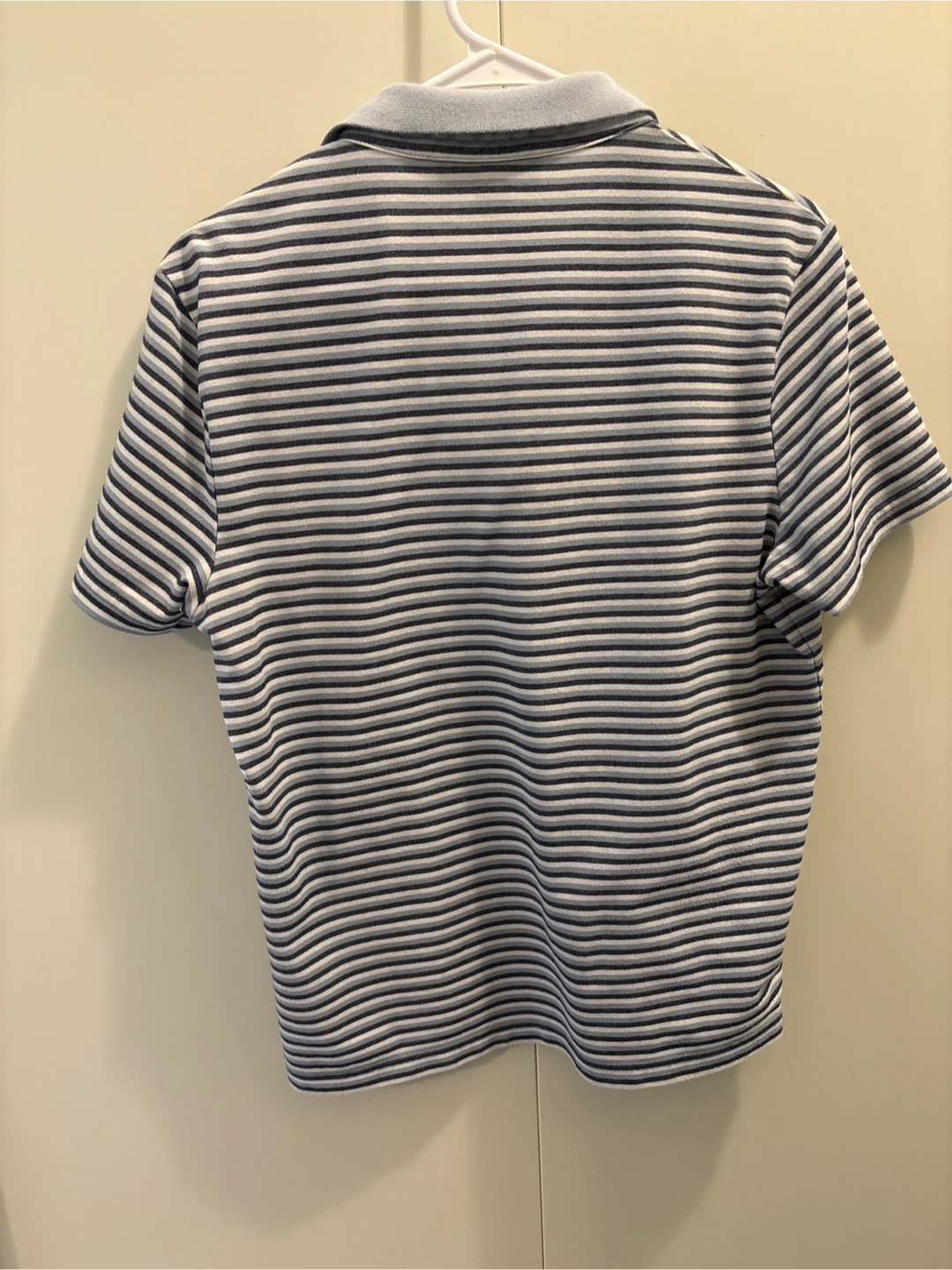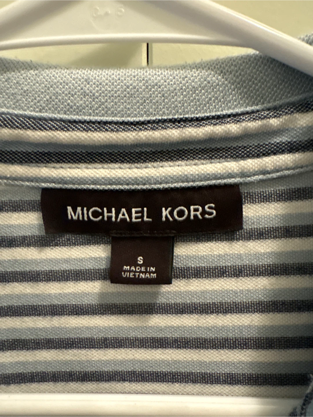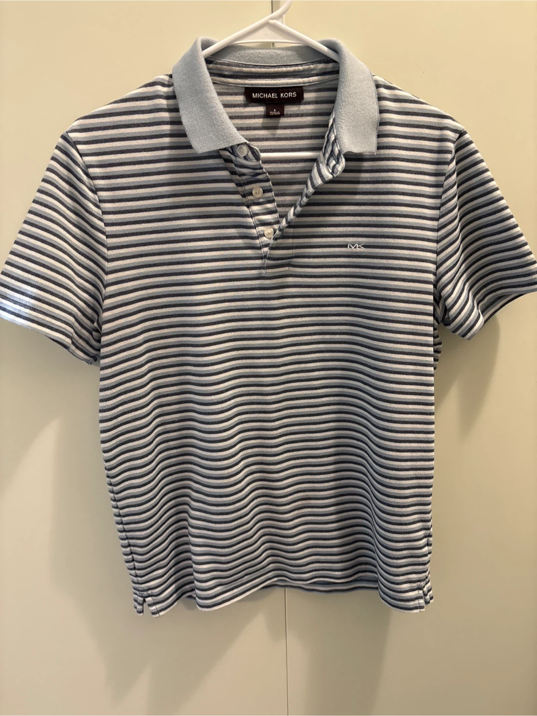 Selling a Michael Kors polo shirt in size small. It features a striped pattern with blue, white, and grey colours. Perfect for a casual look!