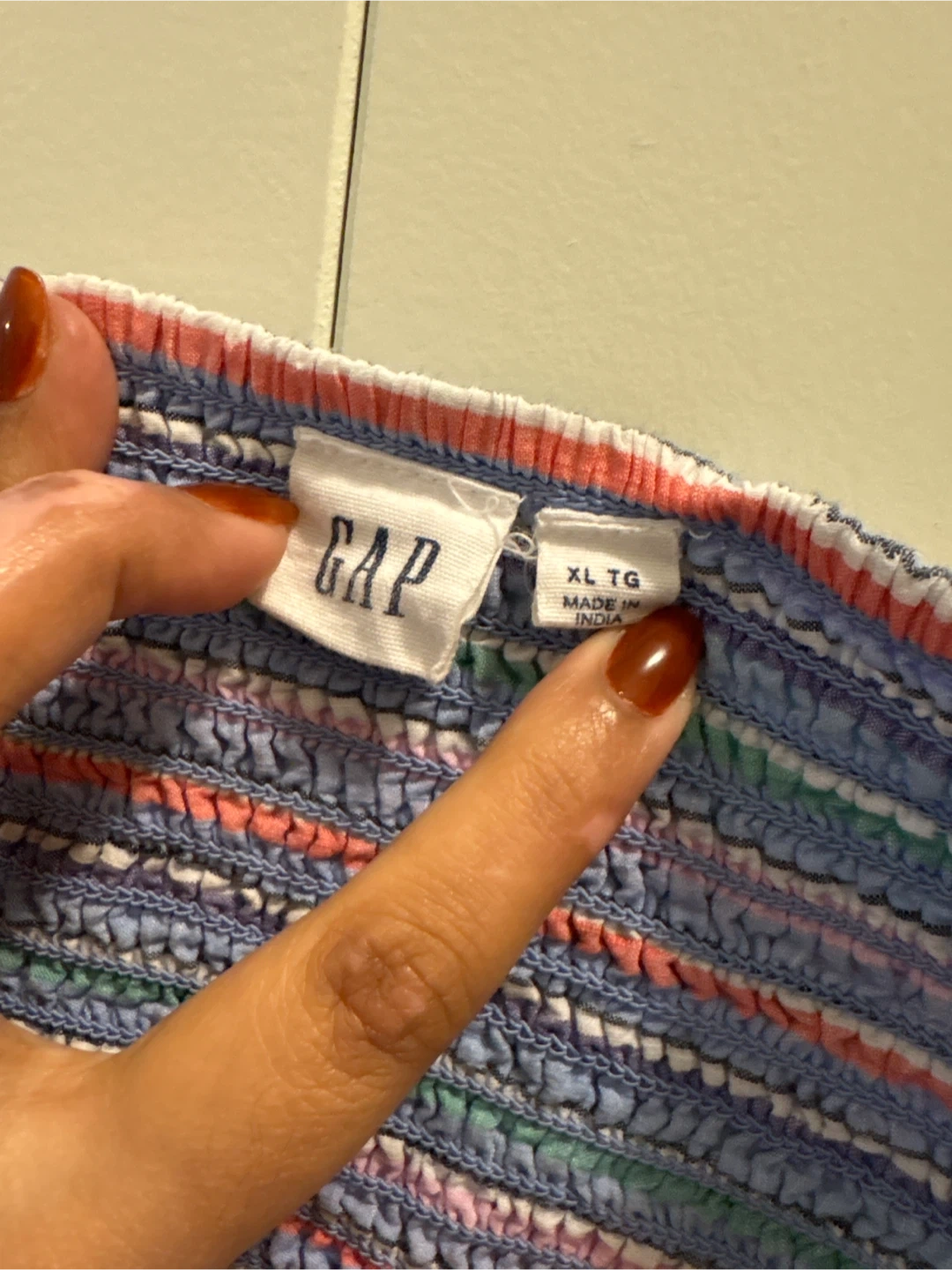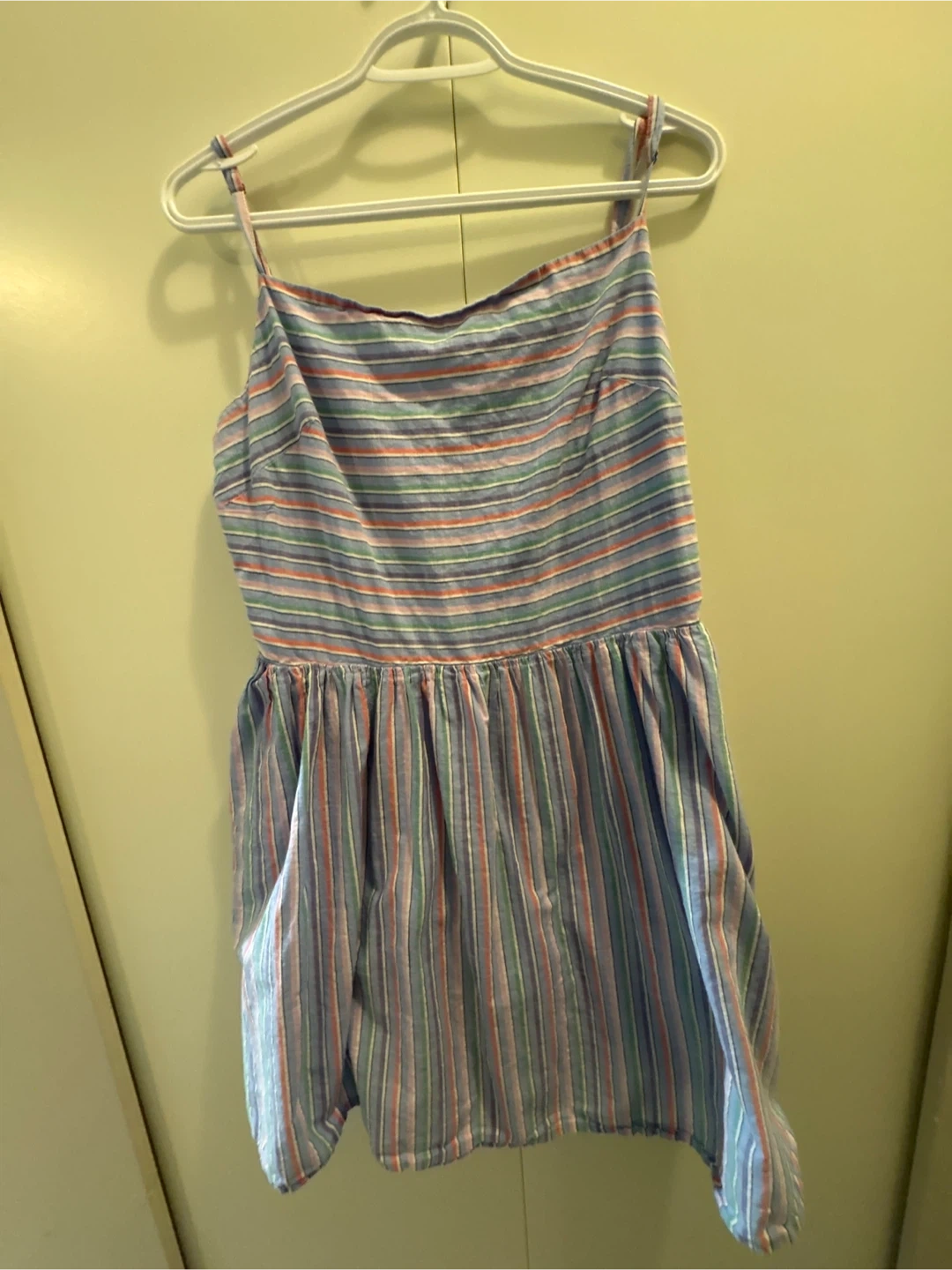 Selling a cute Gap sundress in size XL. It features a colourful striped pattern and a comfortable, flowy fit. Perfect for summer days! Plus it has a pocket 🌸🥹 Needs a bit ironing.