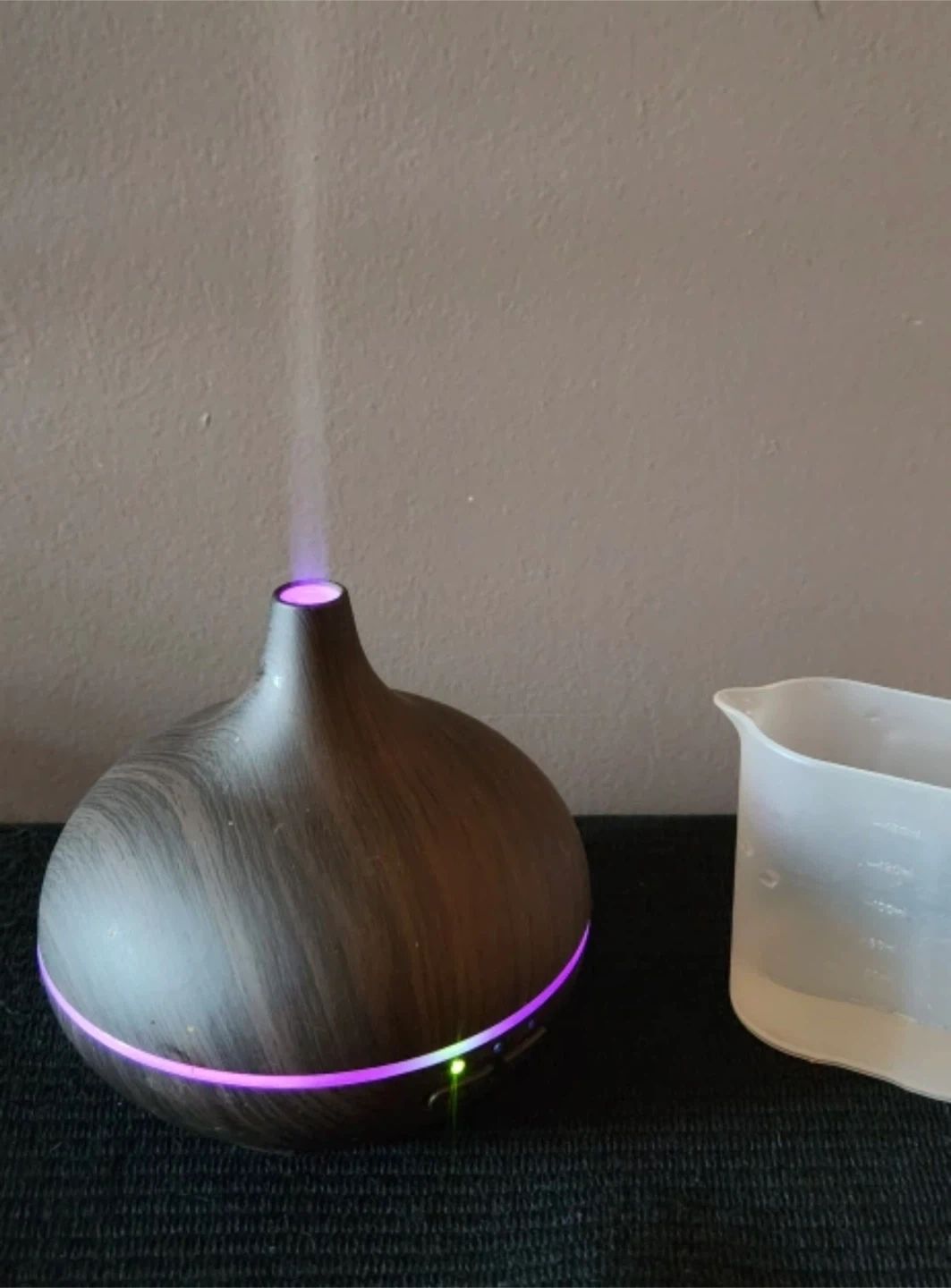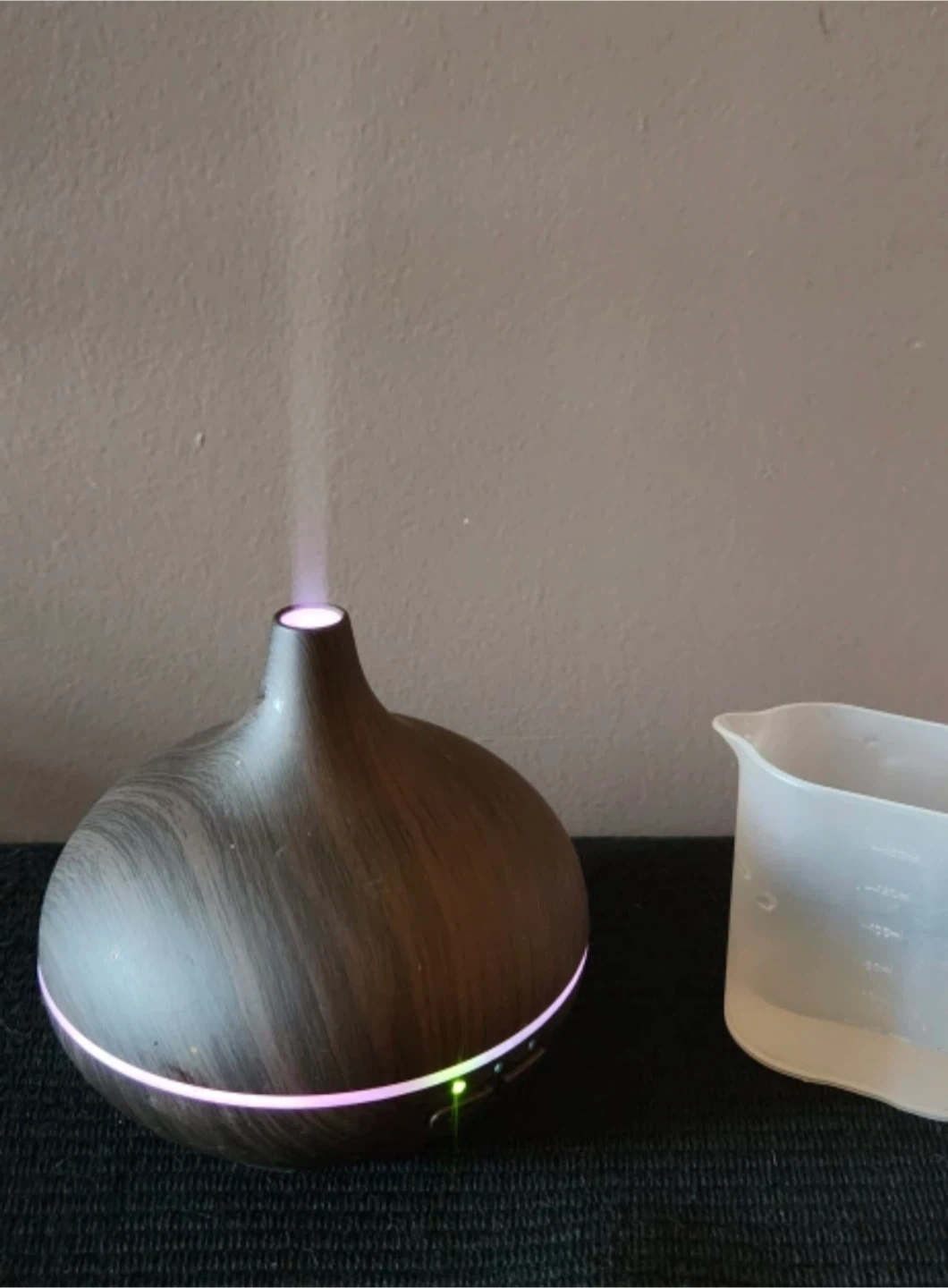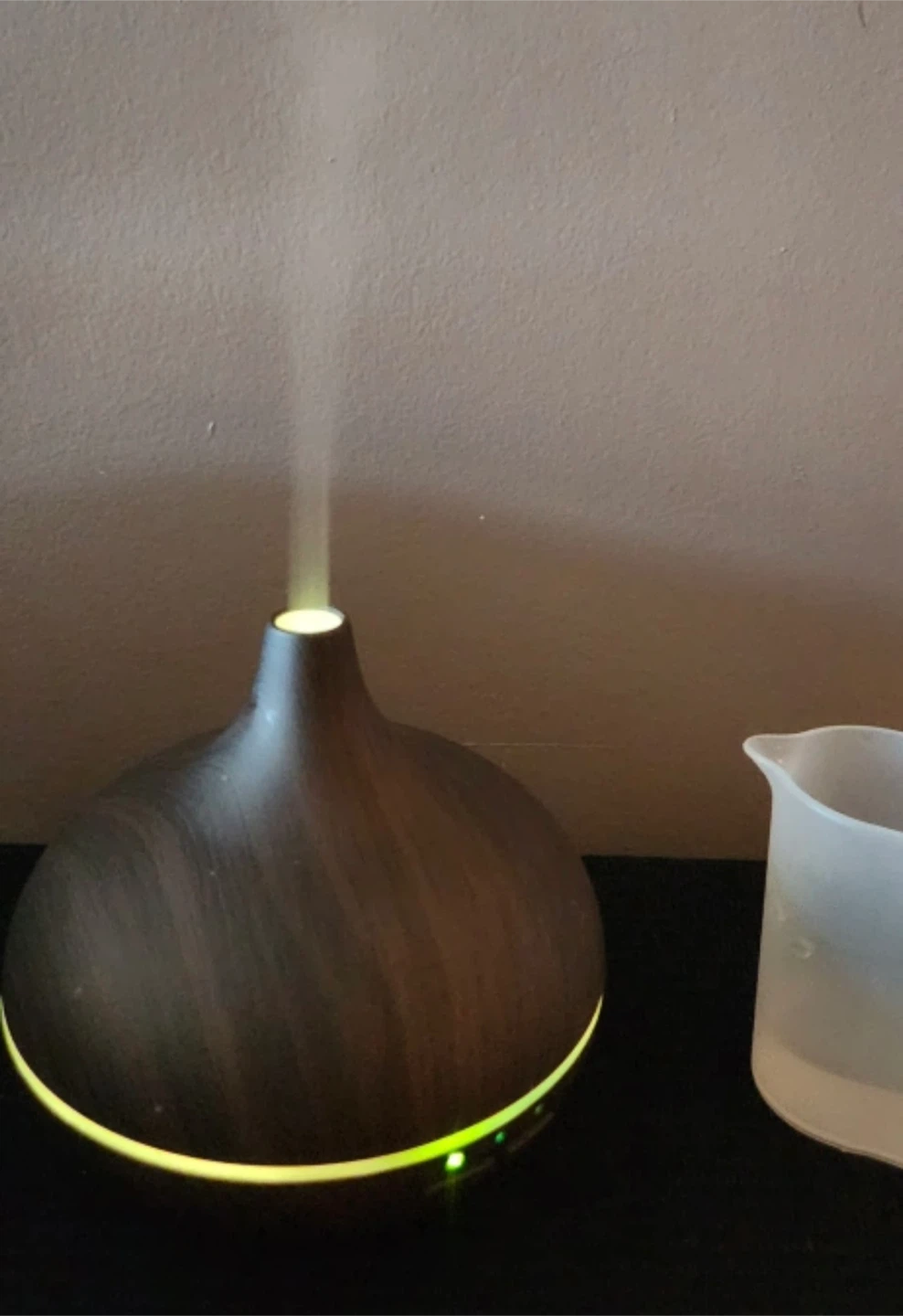 Ultrasonic Essential Oil Scent Diffuser - Dark Wood Grain Aroma, with colour-changing lights to set a relaxing mood. It includes a water measuring cup. This diffuser is also a cool mist humidifier. Perfect for a bedroom, living room, dining room, bathroom or any other room. This aromatherapy diffuser helps alleviate dryness in both winter and summer. It improves breathing and sleep quality, providing a therapeutic effect that relieves sinus congestion and improves breathing, especially when using heating or air conditioning. Excellent condition. From smoke-free, pest-free, and pet-free home.