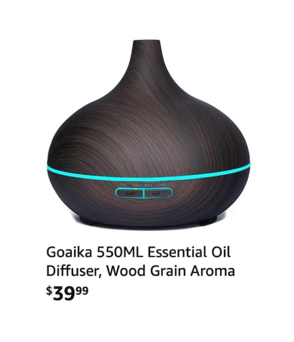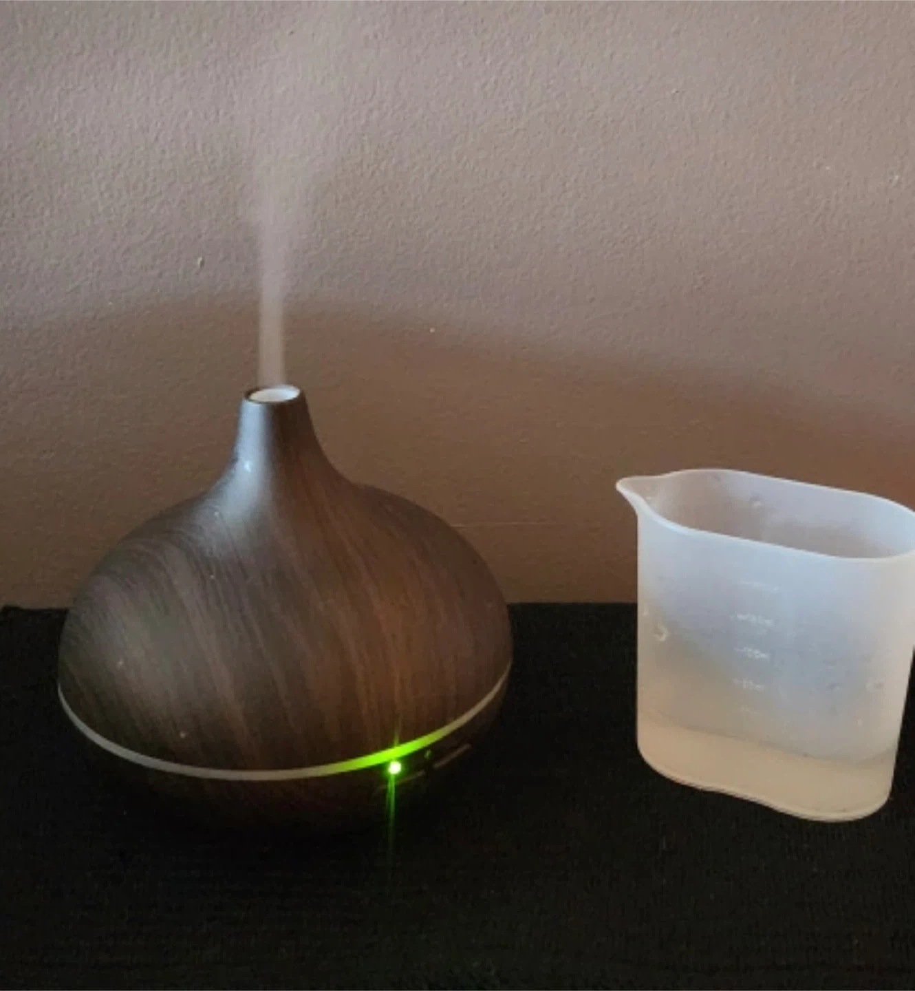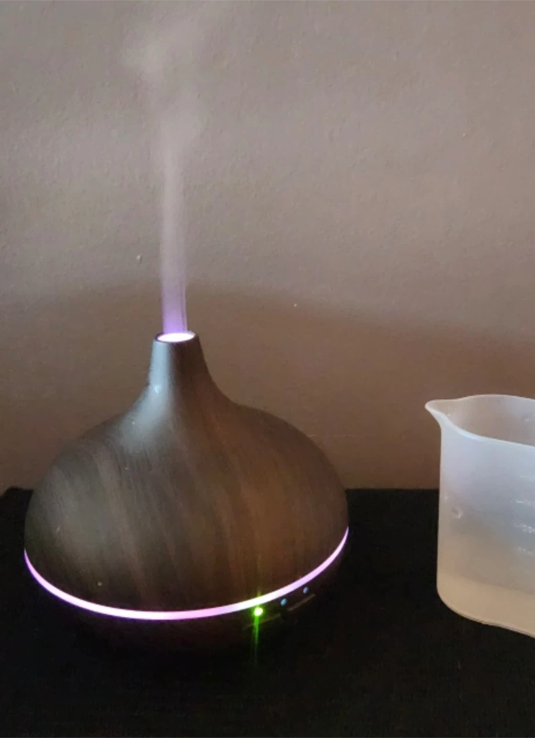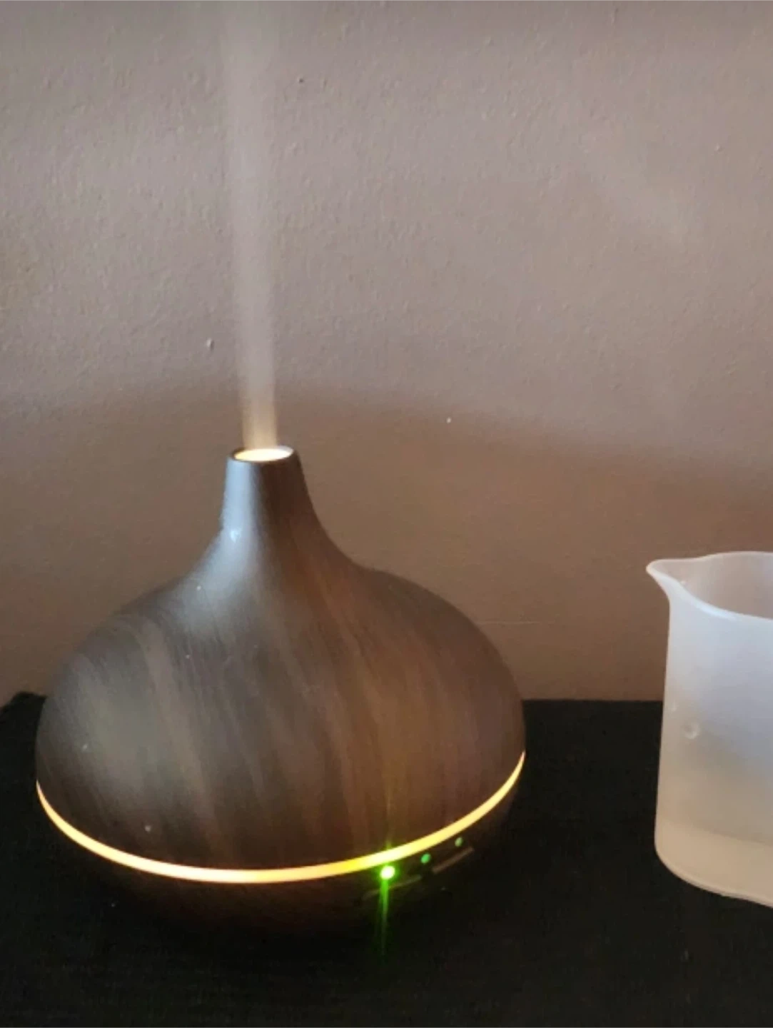 Ultrasonic Essential Oil Scent Diffuser - Dark Wood Grain Aroma, with colour-changing lights to set a relaxing mood. It includes a water measuring cup. This diffuser is also a cool mist humidifier. Perfect for a bedroom, living room, dining room, bathroom or any other room. This aromatherapy diffuser helps alleviate dryness in both winter and summer. It improves breathing and sleep quality, providing a therapeutic effect that relieves sinus congestion and improves breathing, especially when using heating or air conditioning. Excellent condition. From smoke-free, pest-free, and pet-free home.