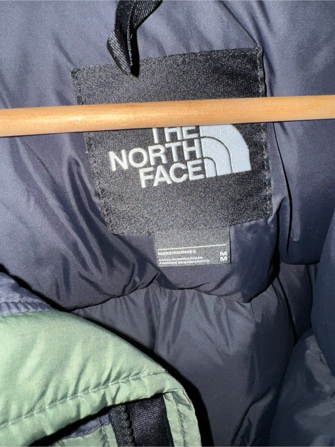 Selling a The North Face puffer jacket in size medium. It's a stylish and warm jacket, perfect for the colder months. The jacket features a two-tone design with a black upper and an olive green lower section. A classic piece from The North Face!