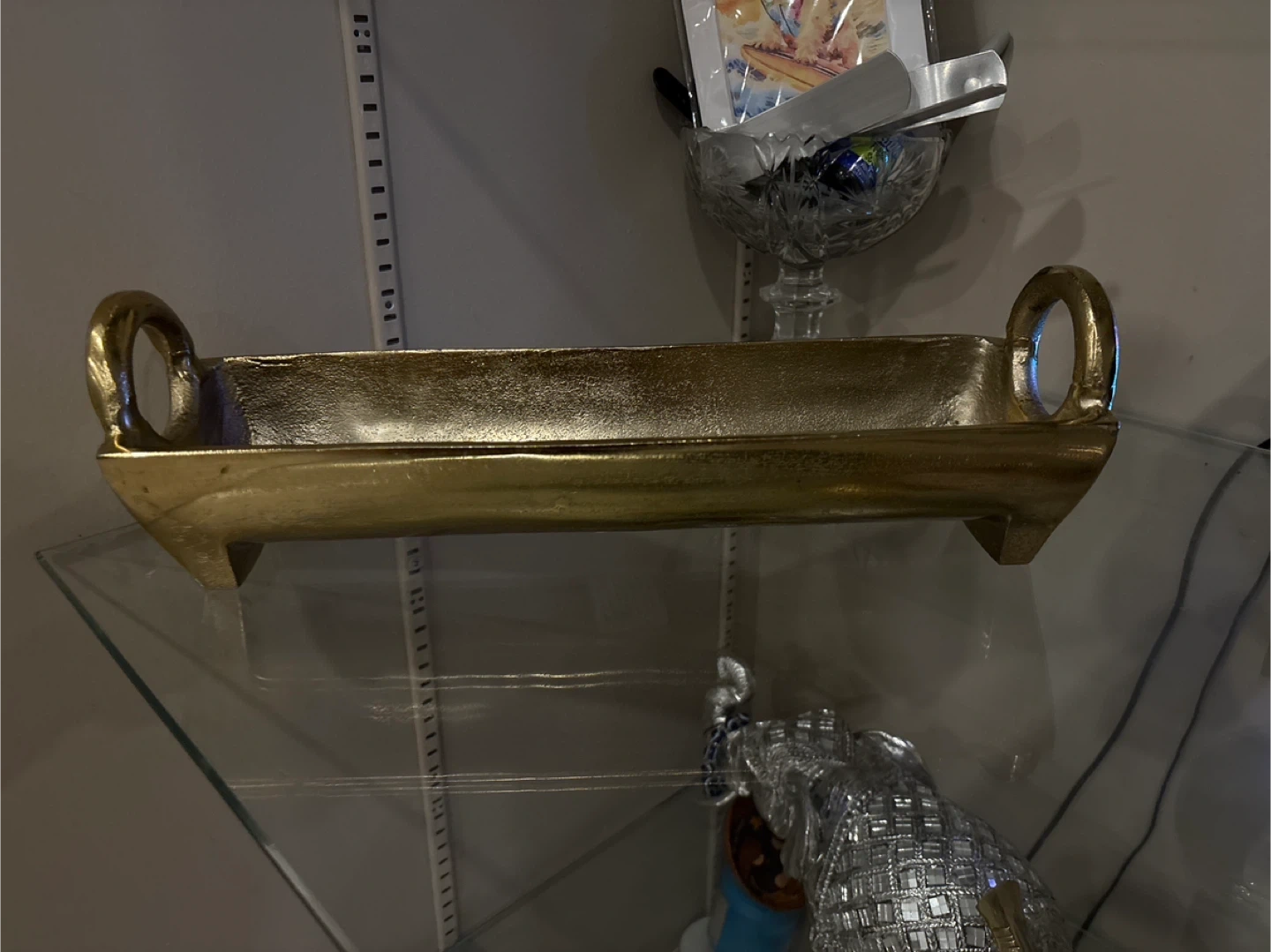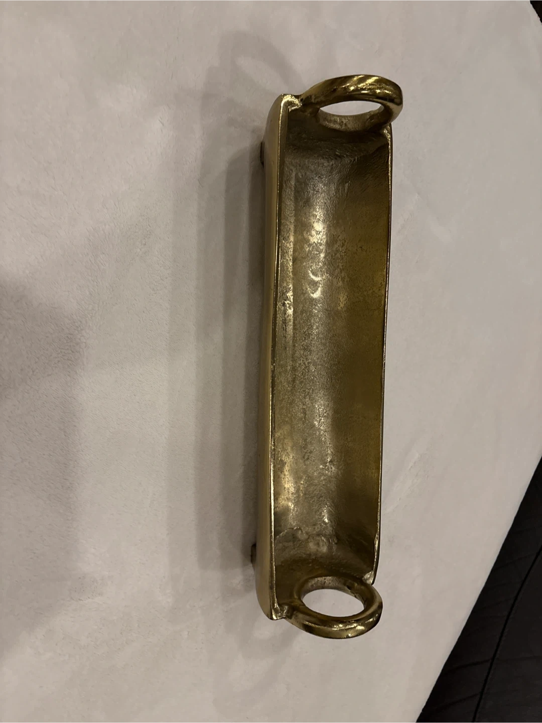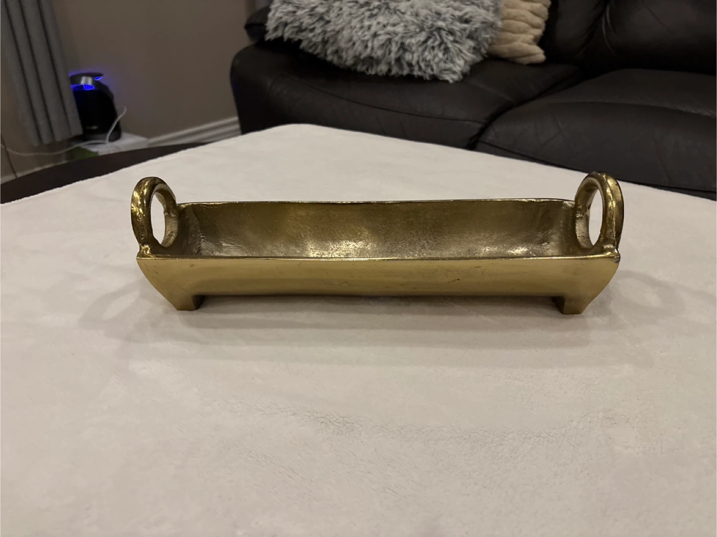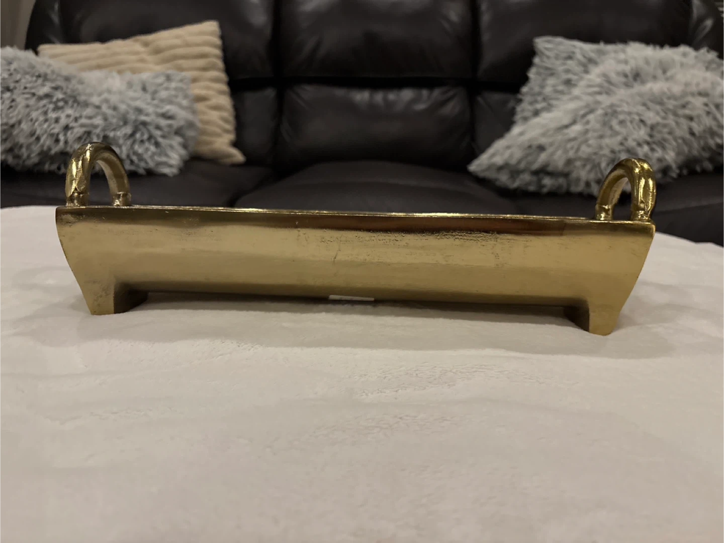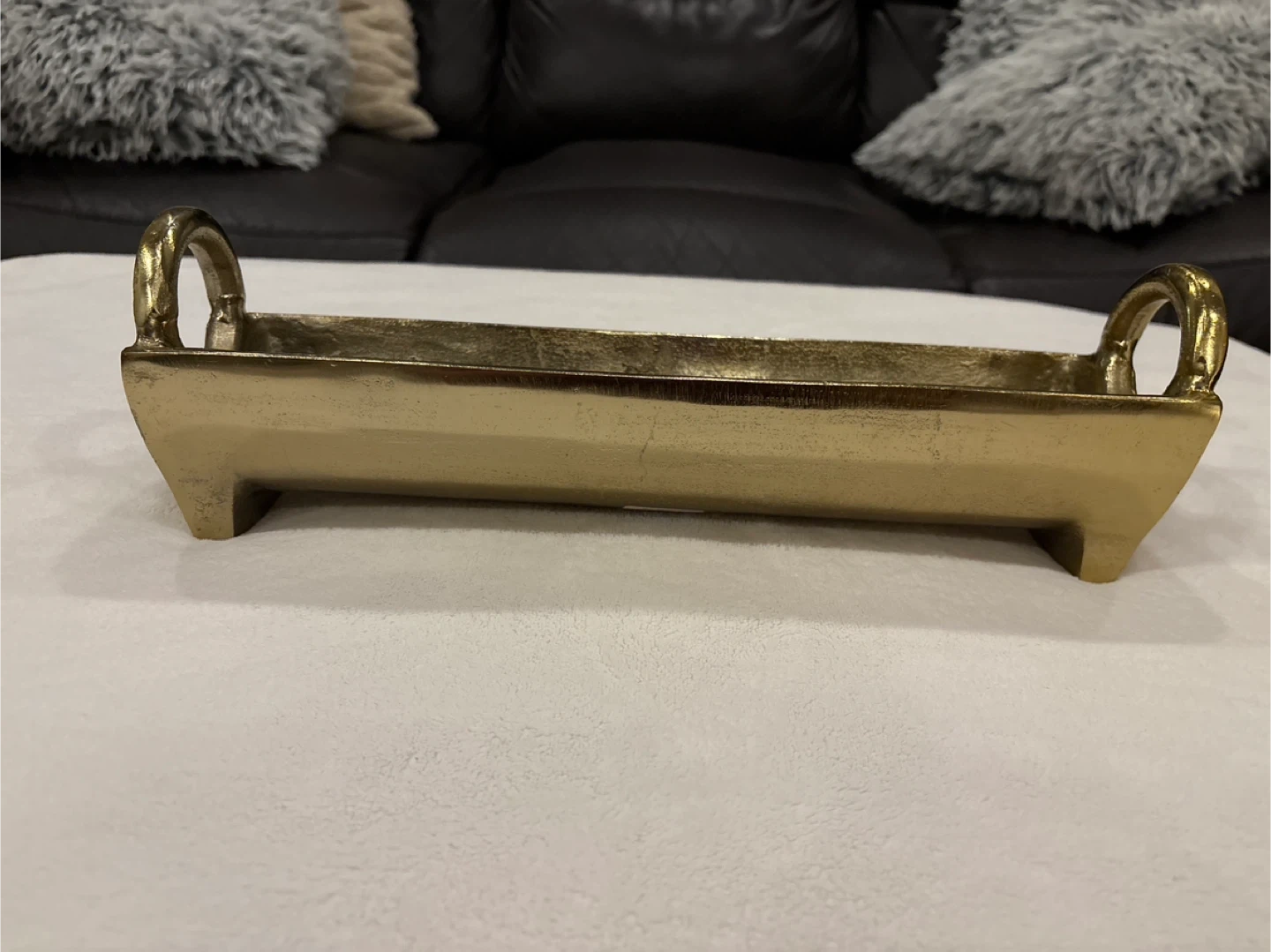 Selling a lovely gold decorative tray! It has a sleek design with handles on each end. Perfect for adding a touch of elegance to your home decor pick up walnut grove Langley