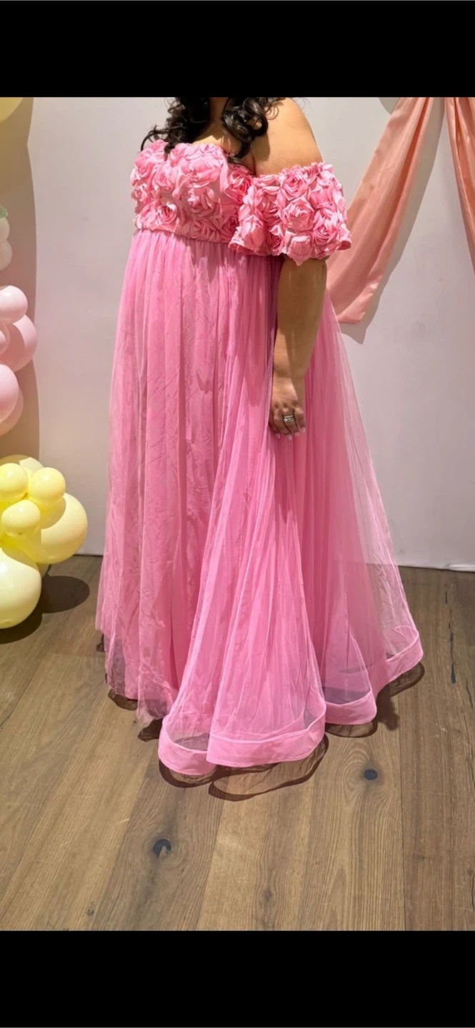 A lovely pink maternity dress with floral details. Perfect for a special occasion or a photoshoot!