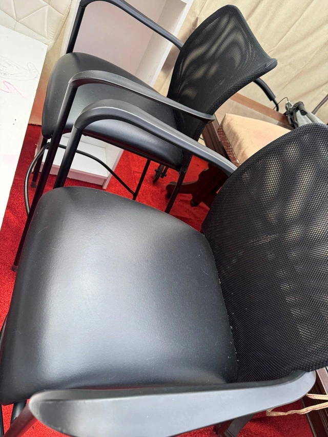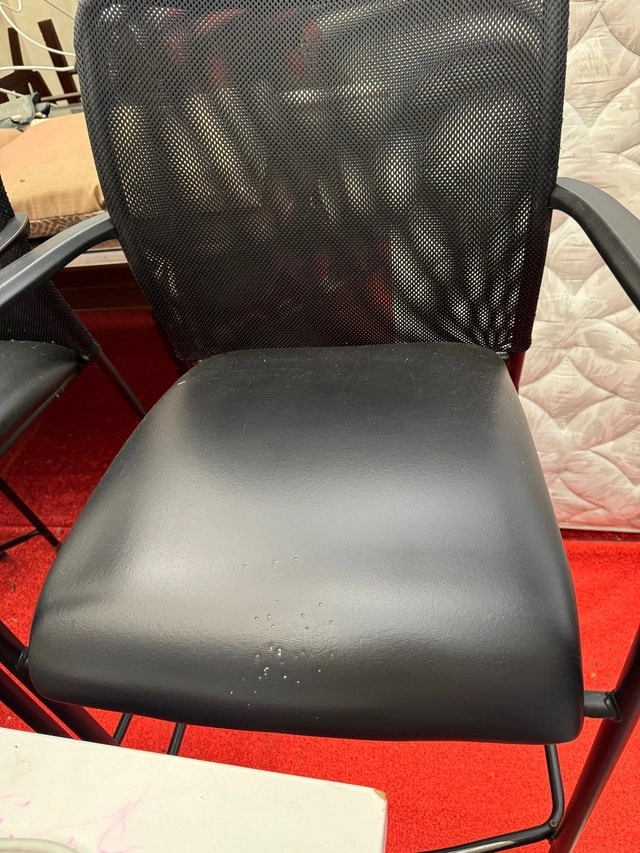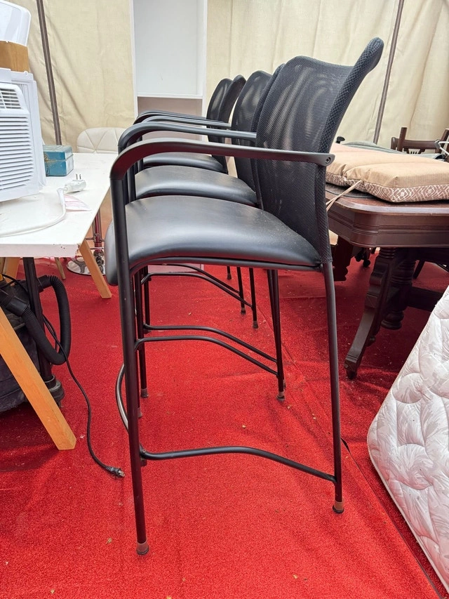 Good condition. Only 4 chairs. Table sold. One chair has a little wear on the seat. $45 each. See pictures. Size: H47 H29 by 18 inches wide. Has special contour back rest design for back comfort.