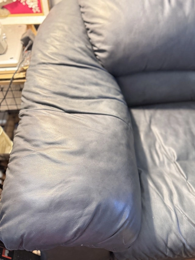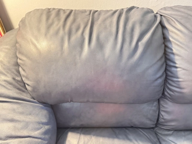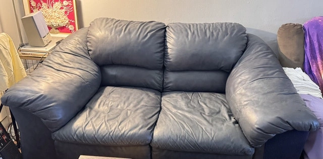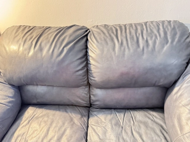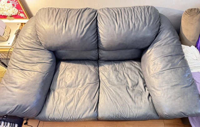 Grey real leather loveseat. Two-seater couch. Plush cushions. Comfortable seating. Made from Italian. Two cushions can be removed for cleaning. There will be no garbage hidden inside. The surface of the sofa can be cleaned with Pledge. Come to see and pay first. Make sure you like it. For Sale By: Owner