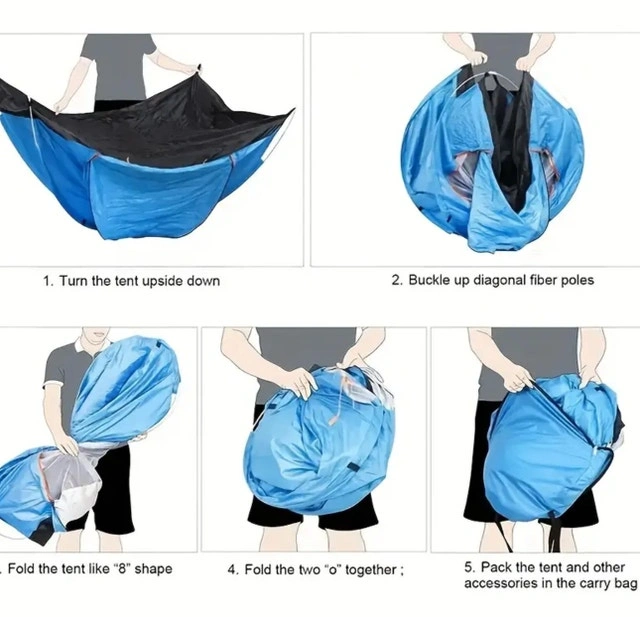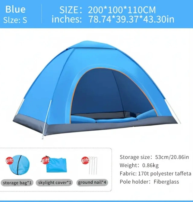 Venture into the great outdoors with this brand new, easy to assemble tent, perfect for camping trips and outdoor adventures! It boasts a convenient setup and is designed for durability and comfort. Specifications: * Size: Small (200*100*110CM) * Weight: 0.86kg * Fabric: 170T polyester taffeta * Pole holder: Fiberglass If the ad is up, the tent is available!