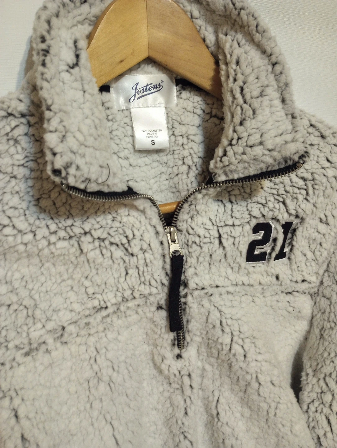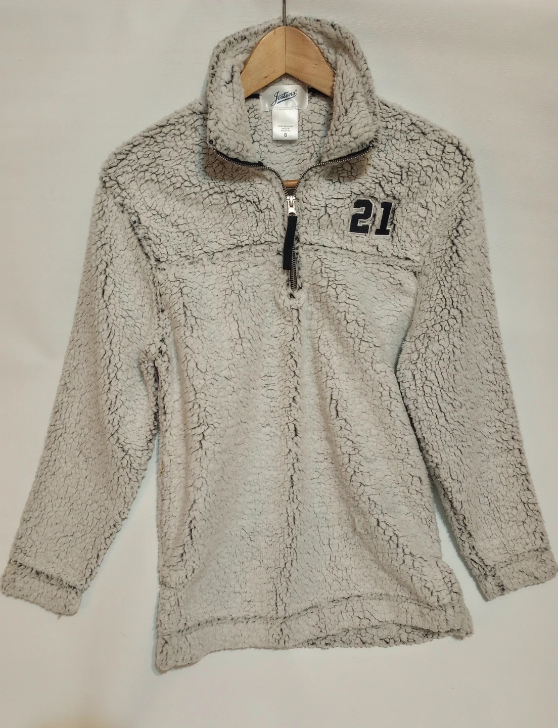 A super cozy sherpa quarter-zip jacket with embroidered "21". White/grey with black details. Barely worn. Perfect for the colder weather!