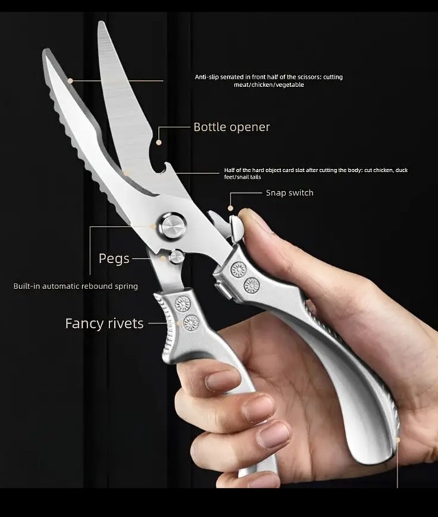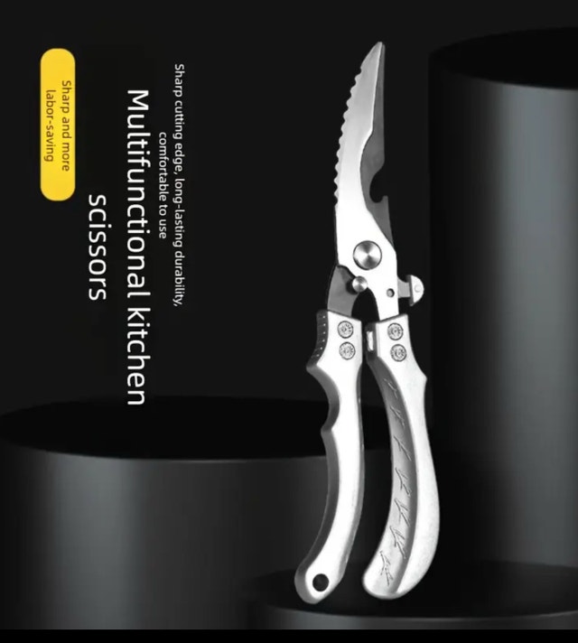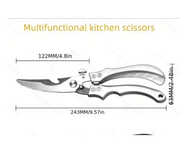 New price firm. I am offering a pair of multifunctional kitchen scissors, perfect for various cutting tasks in the kitchen. The scissors are in new condition and feature a sharp, serrated blade for easy cutting of meat, poultry, vegetables, and more. They also include a bottle opener and a built-in automatic rebound spring for added convenience. These scissors are designed to be durable, comfortable to use, and are a great addition to any kitchen. Features: - Sharp cutting edge - Serrated blade - Bottle opener - Automatic rebound spring - Comfortable grip If the ad is up, they're available.