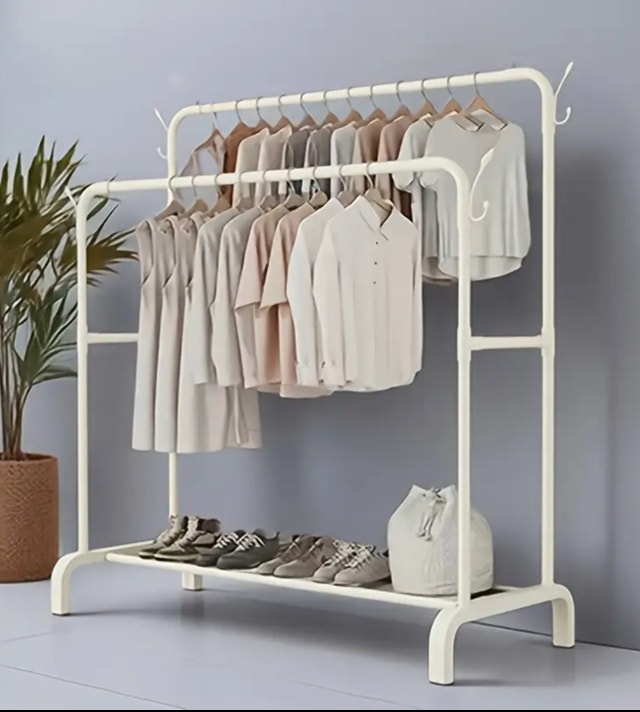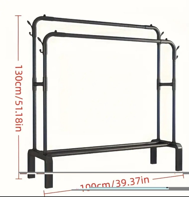 Brand new. Price firm. This sturdy double-rail clothing rack is perfect for adding extra hanging space. It's great for organizing clothes in a spare room, laundry room, or even a retail setting. The rack features two rails for hanging clothes and a bottom shelf for shoes or storage bins. Additional Specifications: * Double-rail design for maximum hanging space * Bottom shelf for shoes or storage * Sturdy metal construction * Easy to assemble * Dimensions: As shown in the pictures. If you see this ad, it's still available!