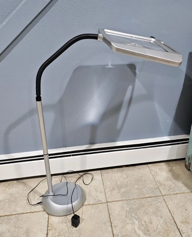 Illuminate your hobbies with this Daylight24 magnifying floor lamp! This lamp features an 8-inch x 10-inch, 3x magnification shade, perfect for reading, crafting, sewing, or any detailed work. The adjustable gooseneck allows you to tilt and swivel the light exactly where you need it, and the convenient handle makes it easy to move. This lamp is in good, used condition. Additional Specs: * Full Page Size Magnifier * 8-Inch x 10-Inch - 3X magnification shade * Adjustable Gooseneck * Convenient Handle Comparable units are selling for between $75-$150 on Kijiji, so I have priced to sell. If the ad is live, the item is available. So go ahead and treat your eyes!