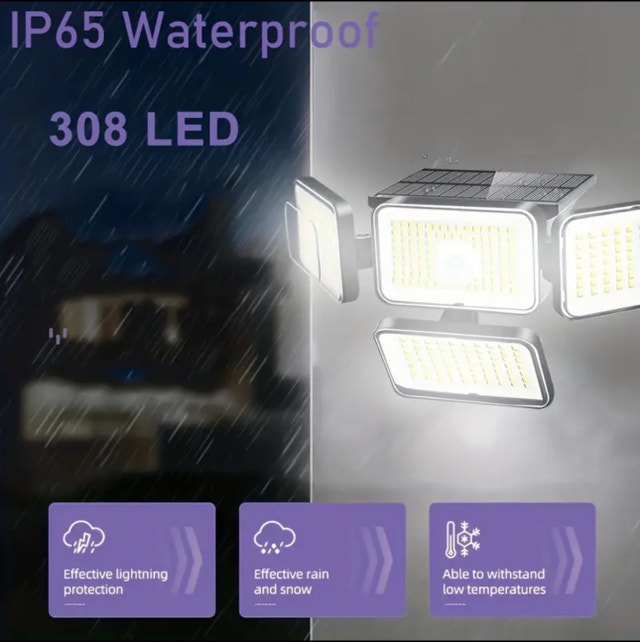 Illuminate your surroundings with this new 308 LED Solar Powered Motion Sensor Outdoor Light, perfect for providing reliable and energy-efficient lighting for your outdoor spaces. This light features a robust design, is waterproof with an IP65 rating, and offers adjustable omnidirectional lighting. Key Features: * 308 LED lights for superior brightness * Solar-powered for energy efficiency * Motion sensor for automatic activation * Waterproof IP65 rating * Omnidirectional adjustable lighting This solar light is not just functional, it’s like having a personal spotlight that dances to the tune of the sun! Grab it before it decides to light up someone else's life. If the ad is up, the light is on and ready to shine in your hands!
