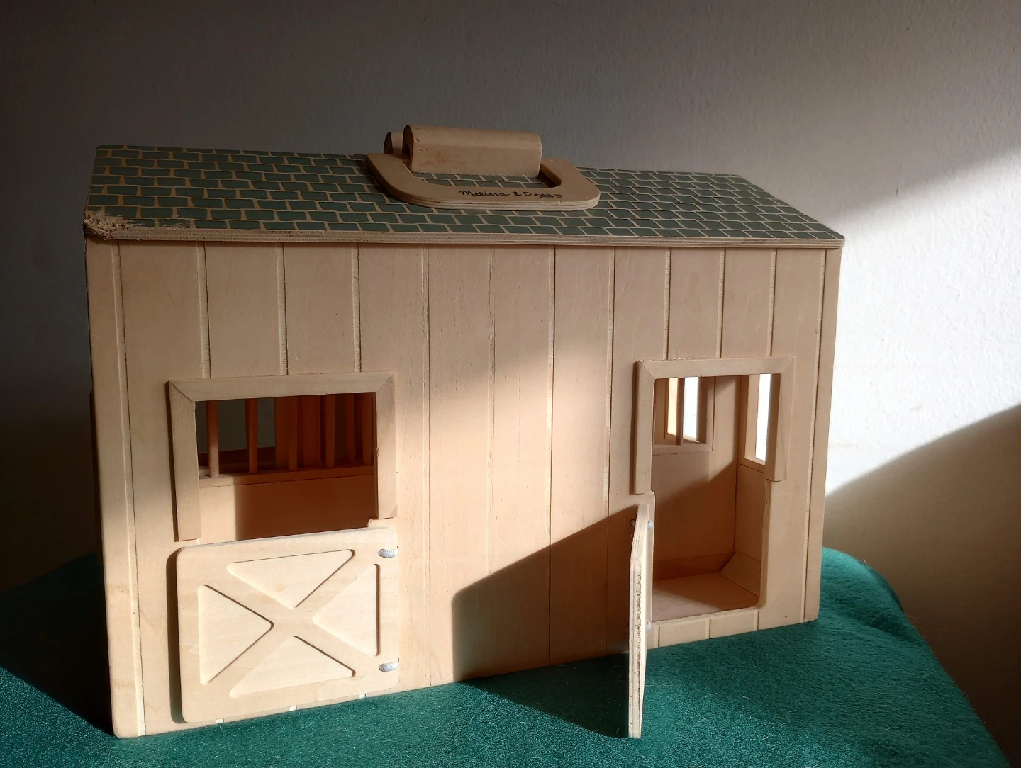 A Melissa & Doug "Fold & Go" wooden toy stable featuring a secure handle for travel, open-able gates, and sliding stall doors. Includes 4 matching haybales and a ladder.