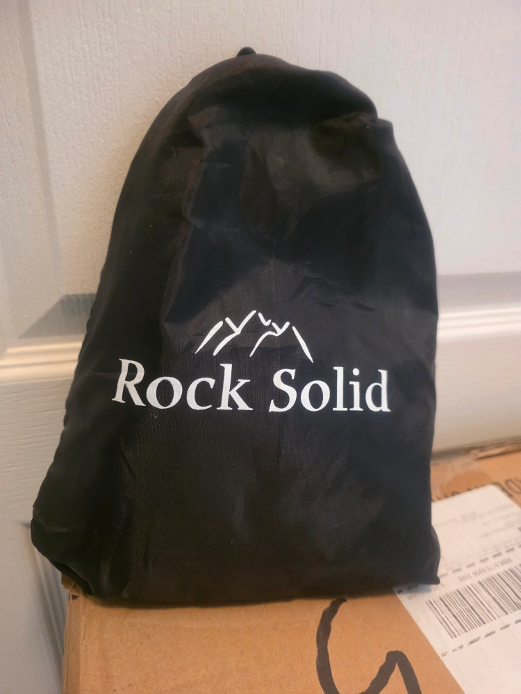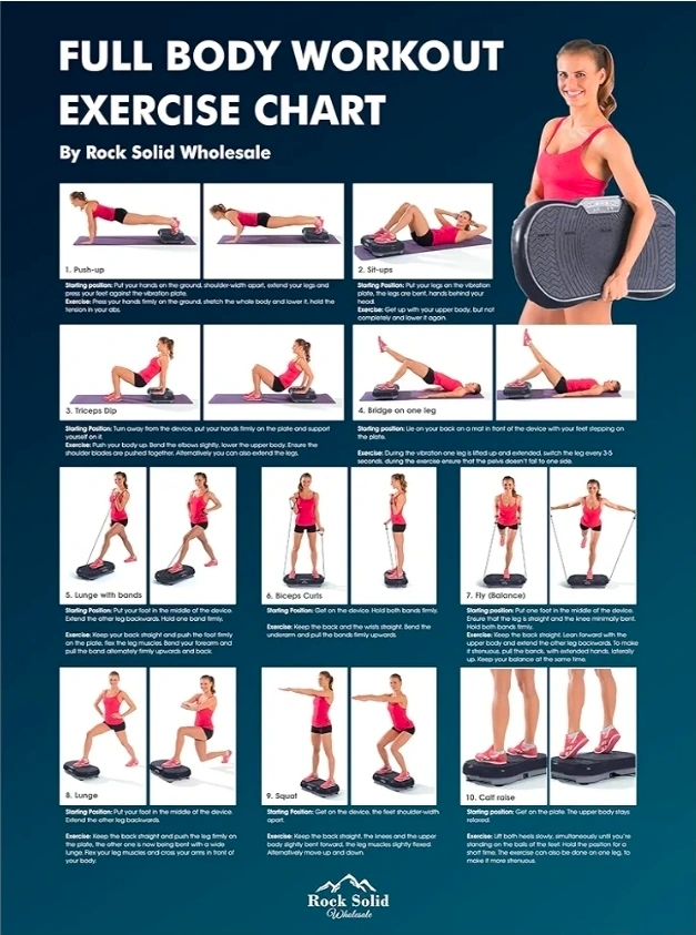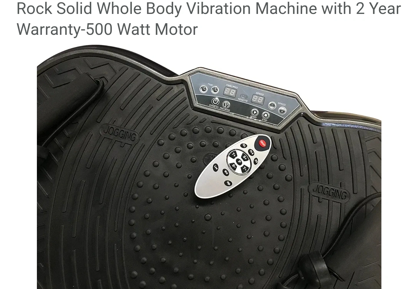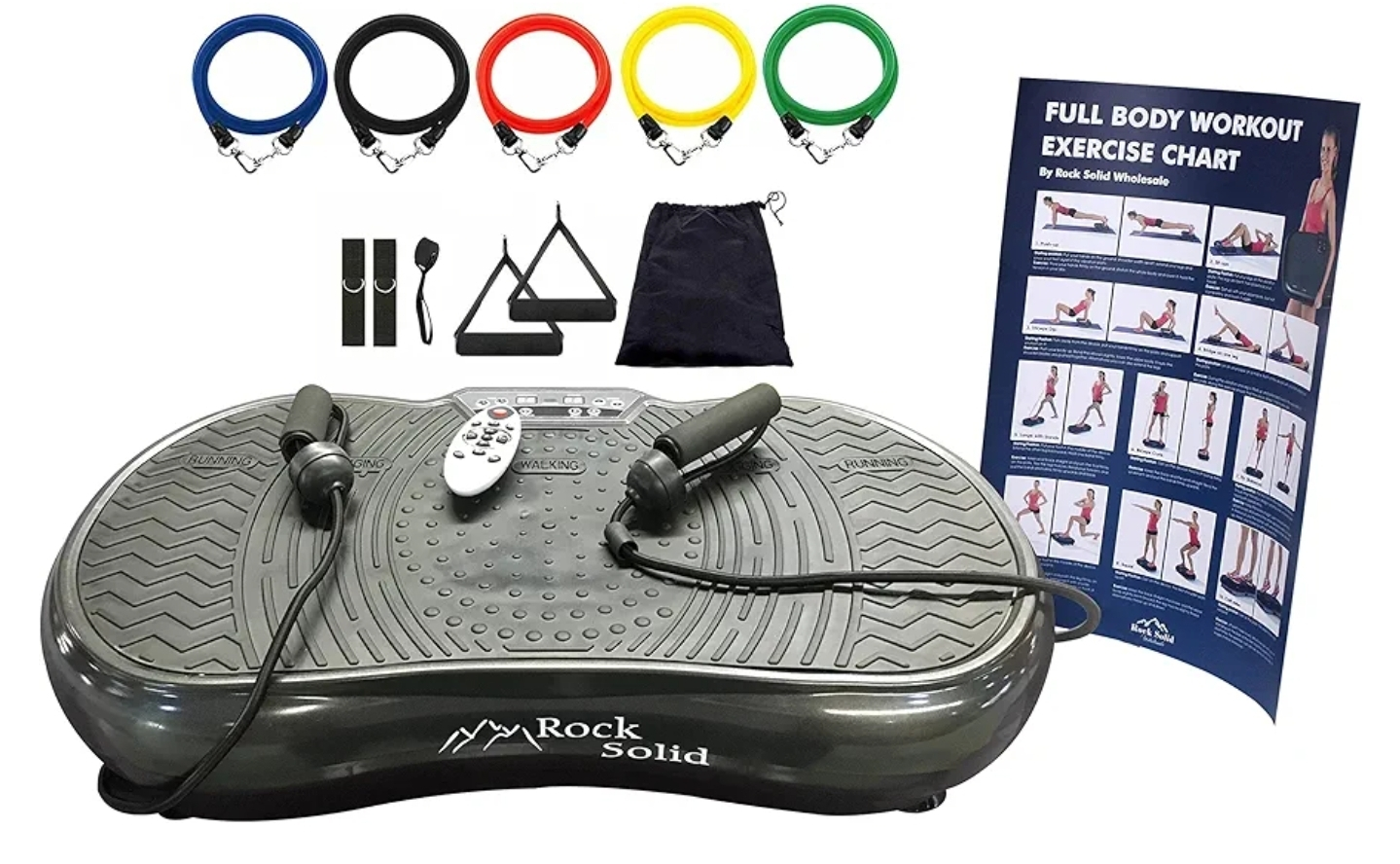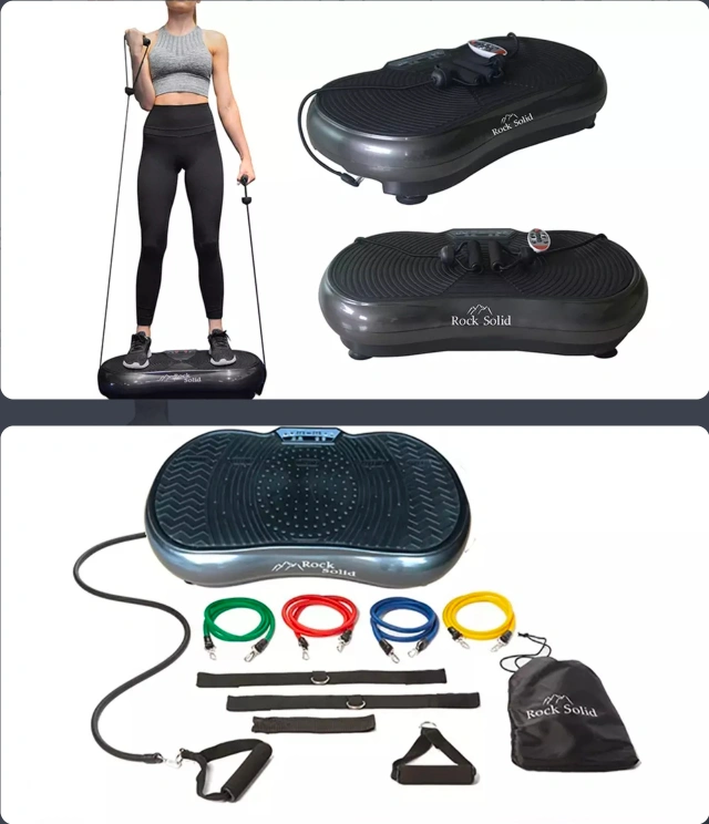 Get a full body workout with this Rock Solid vibration machine! It comes with resistance bands, handles, and a remote. There's also an exercise instruction chart to help guide your workouts. Tried once just to be tested. Still in shipping box, opened just two take pictures.