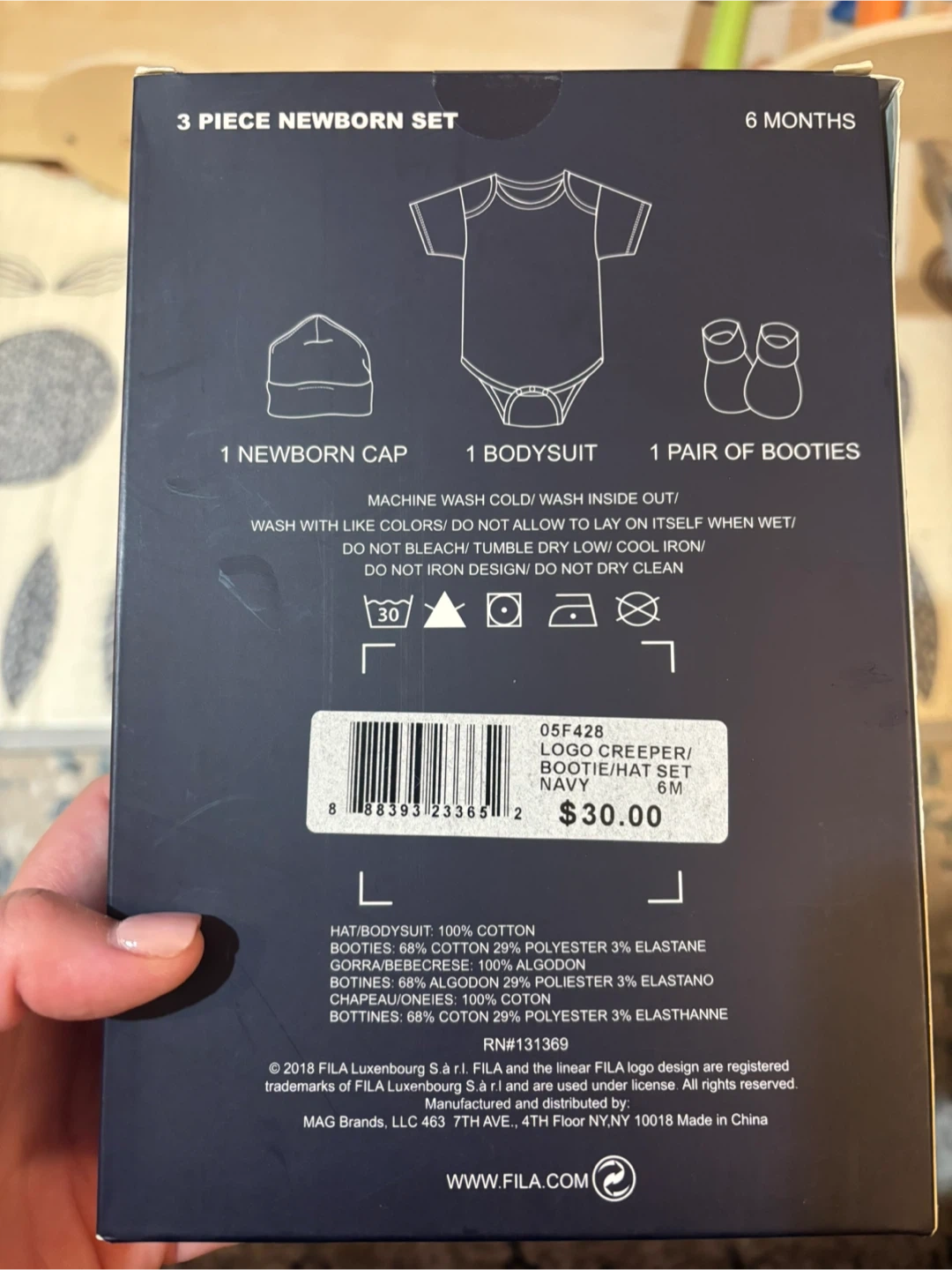 Selling a brand new Fila 3-piece newborn set, perfect for a little one around 6 months old! The set includes a newborn cap, a bodysuit, and a pair of booties. The original price was $30.00.