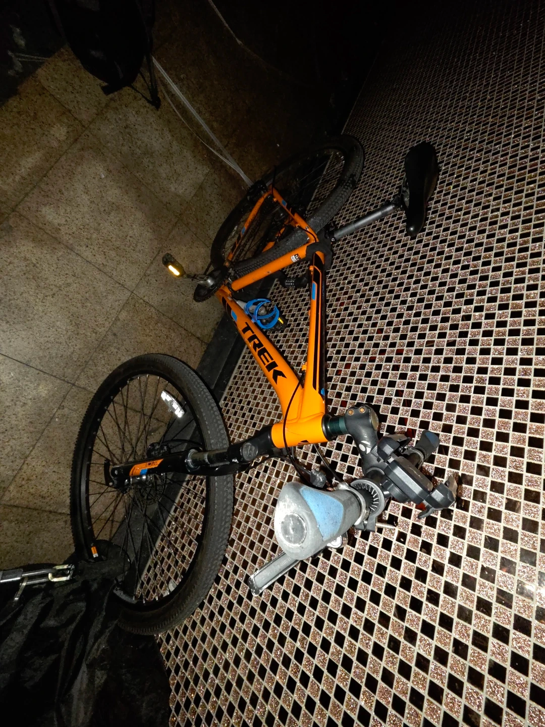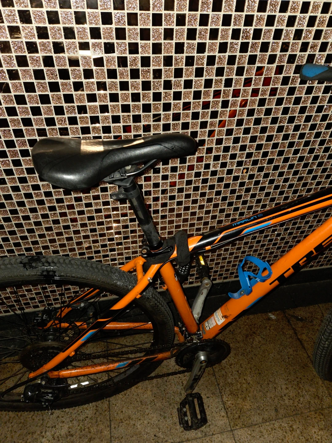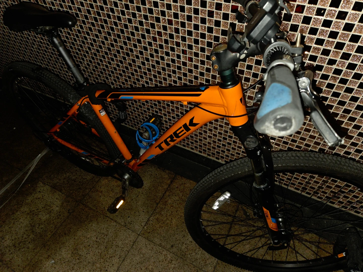 Selling a Trek Marlin mountain bike in orange.wirh blue highlighted remarks just as the cupholder It's in good condition