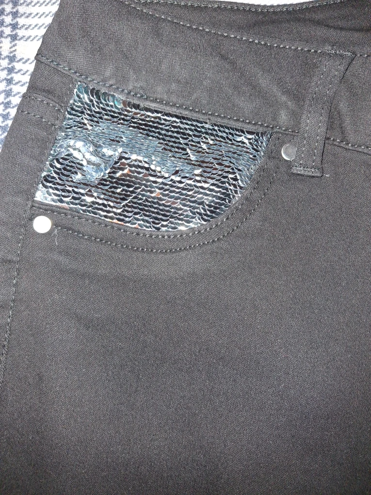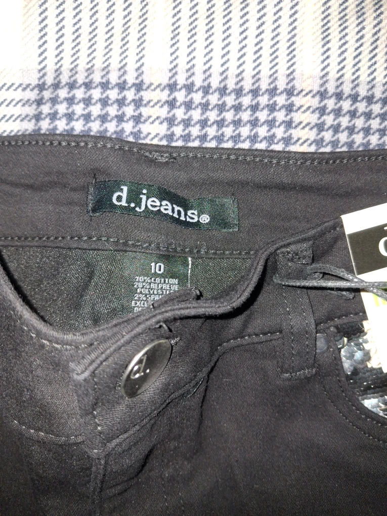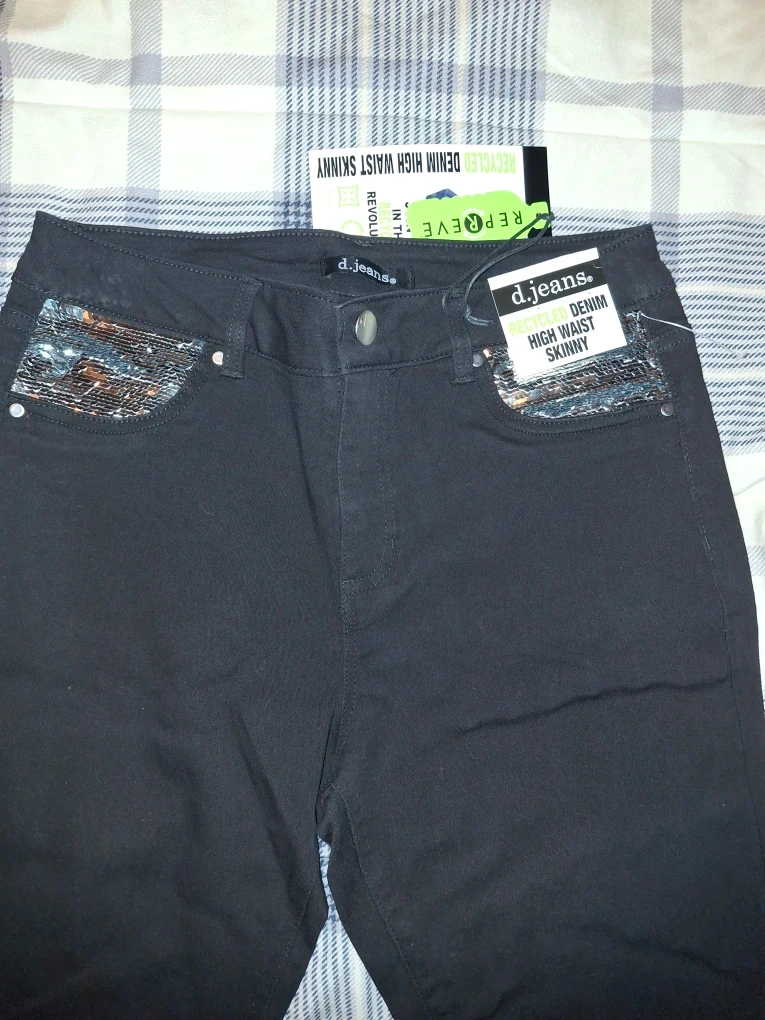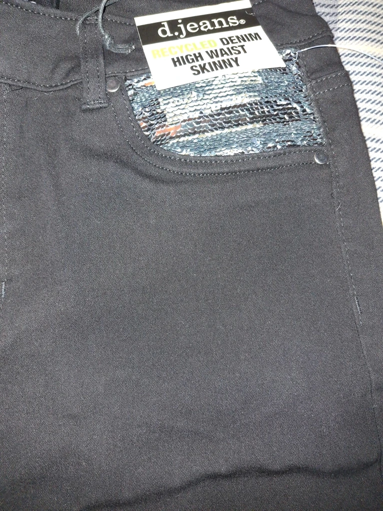 Selling a pair of d.jeans recycled denim high waist skinny jeans in size 10! They are a stylish black color and feature a unique sequin detail on the front pockets. The material is 70% cotton, 28% repreve polyester, and 2% spandex.
