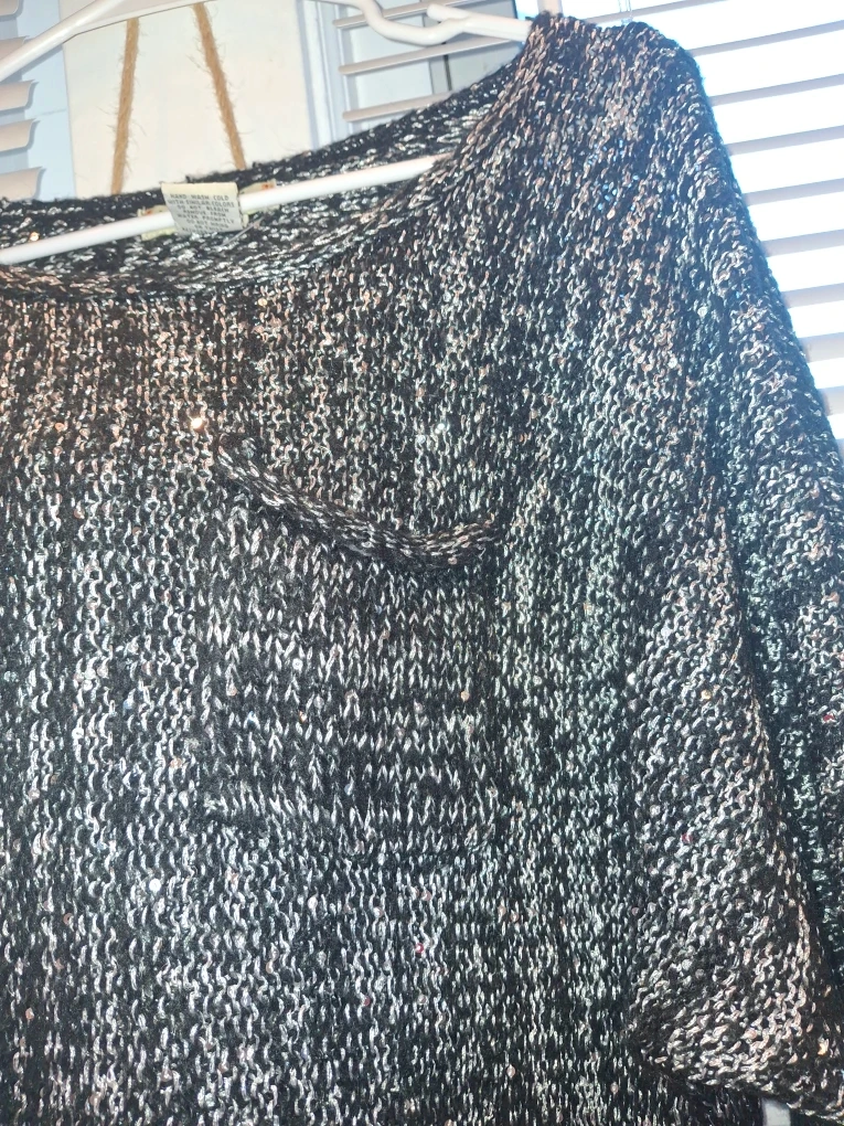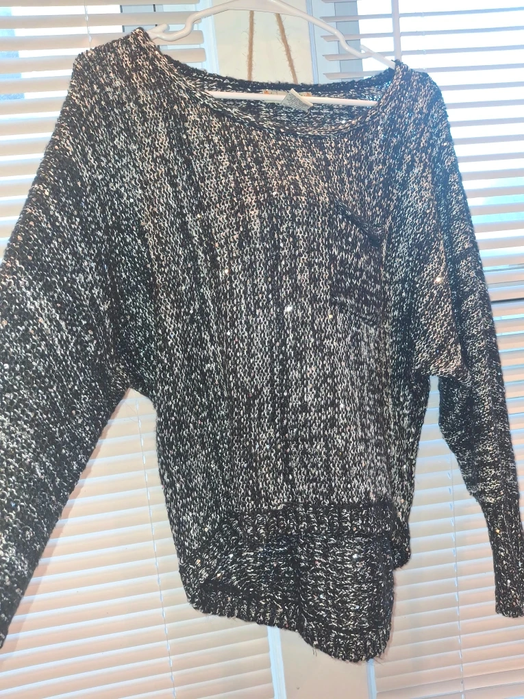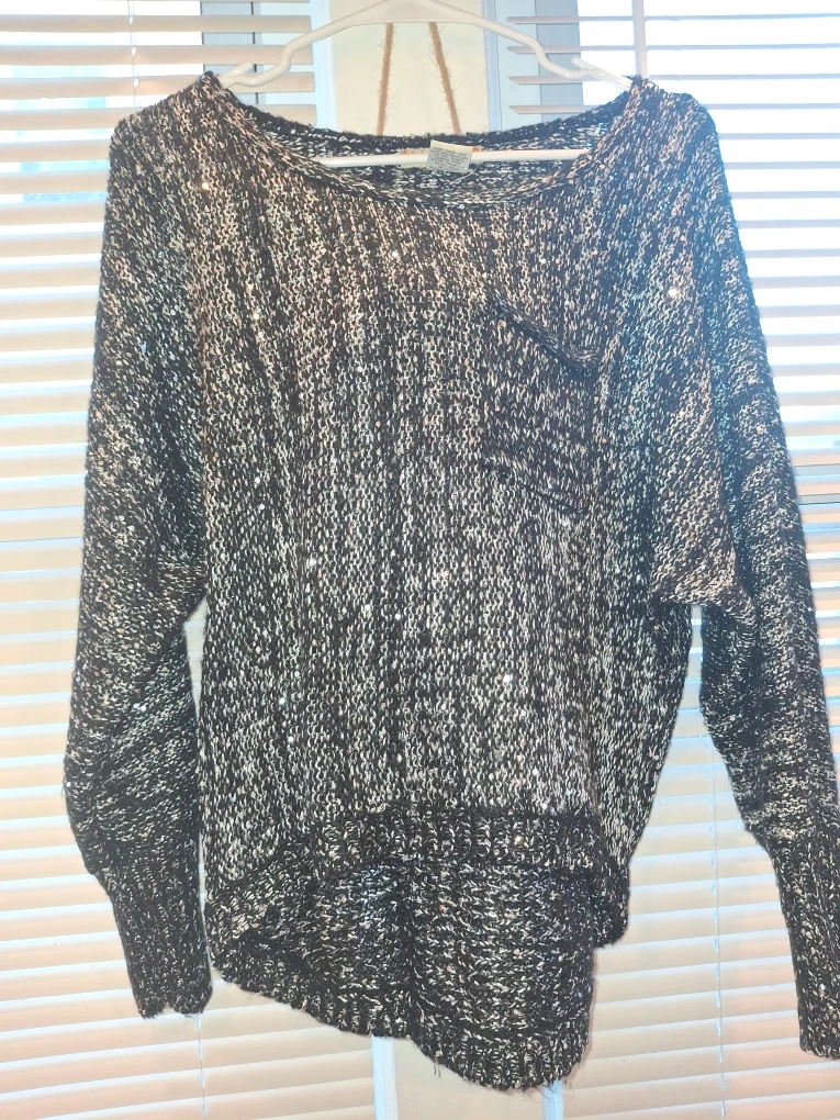Here's a cozy black and white knit sweater! It's perfect for layering or wearing on its own. The material is soft and comfortable, making it a great addition to any wardrobe. It's in great condition and ready for a new home!