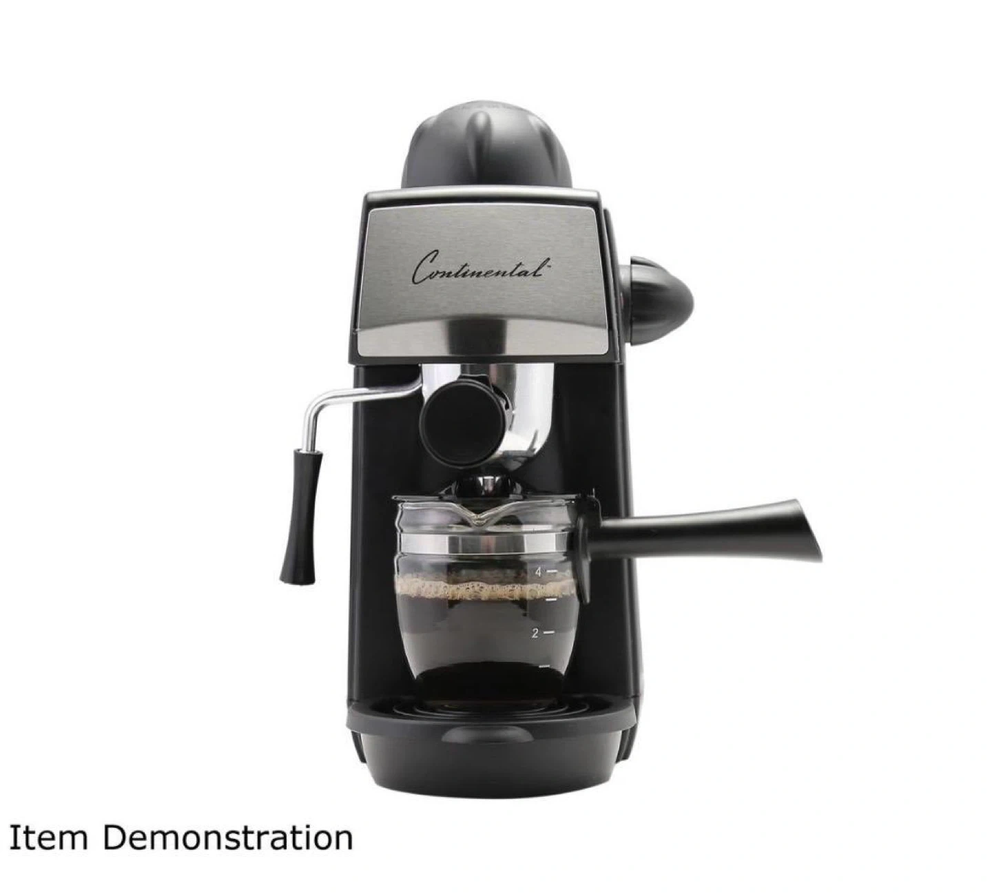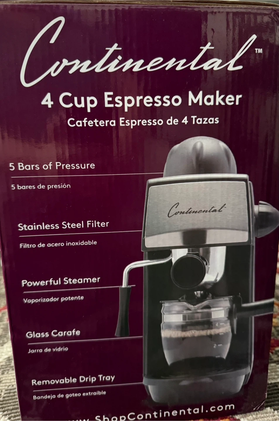 Selling a Continental 4 Cup Espresso Maker! It features a 4-cup capacity and 5 bars of pressure for that perfect morning rush. The espresso maker also has a frother, a stainless steel filter, a powerful steamer, a glass carafe, and a removable drip tray. It also has a 2 year warranty! Box is included