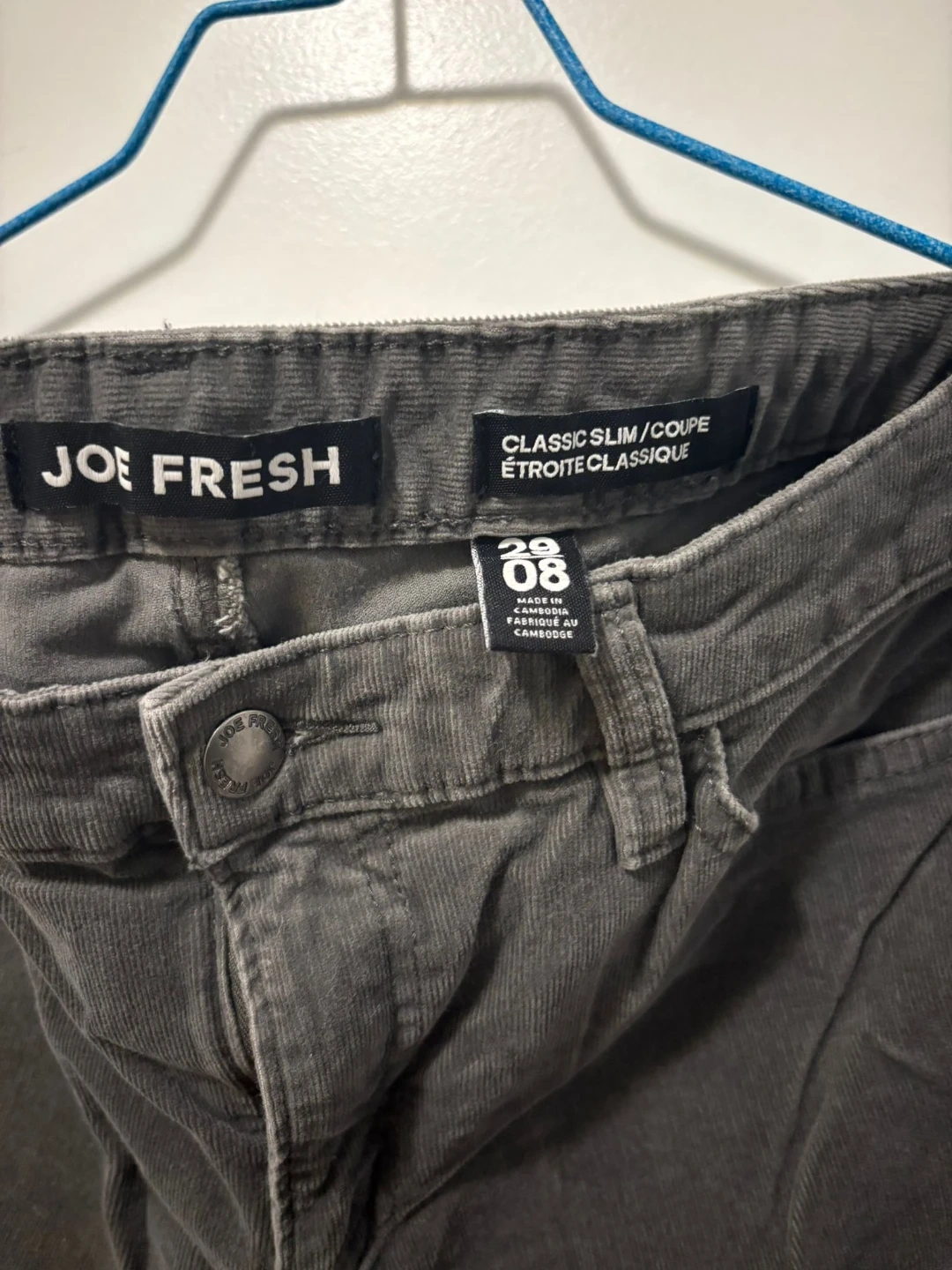 Selling a pair of Joe Fresh classic slim corduroy pants in a neutral grey colour. They're in great condition and ready for a new home! Size 29.