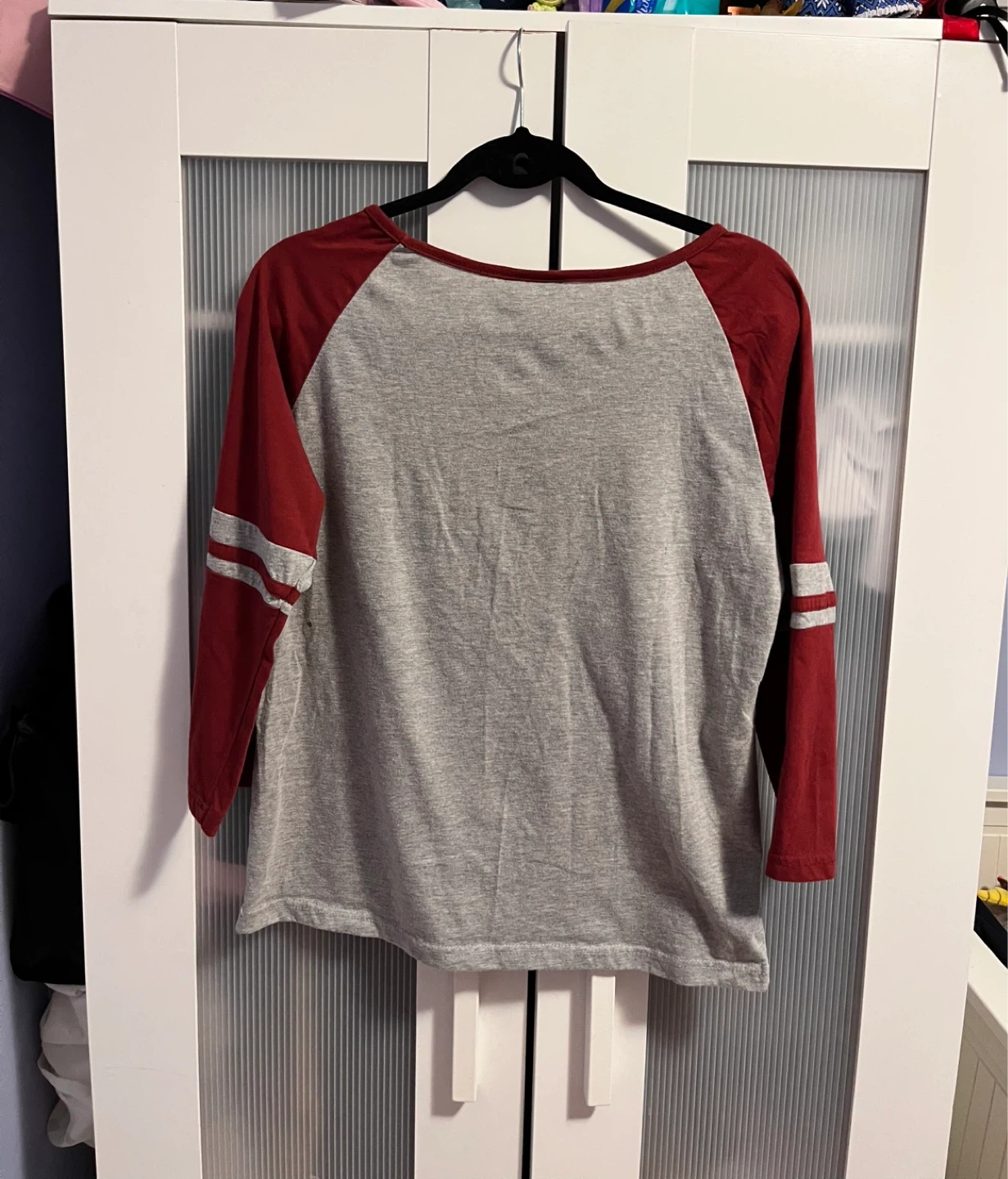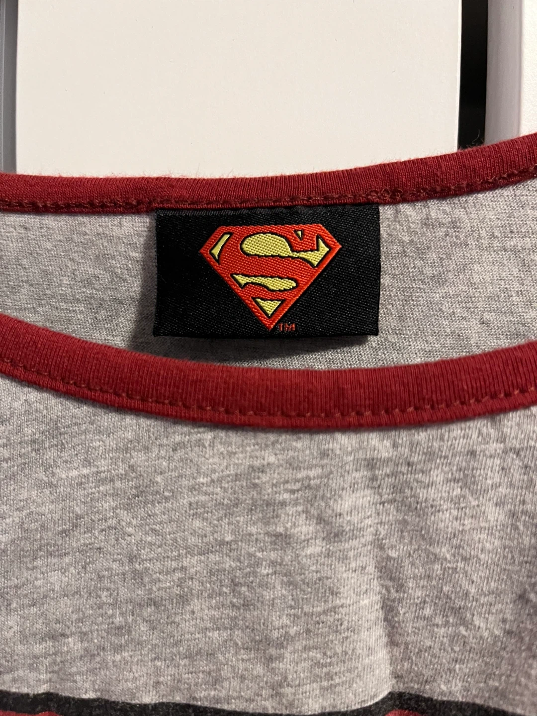 Selling a Superman long sleeve shirt. It's grey with red sleeves and trim, featuring the classic Superman logo on the front. Perfect for any fan!