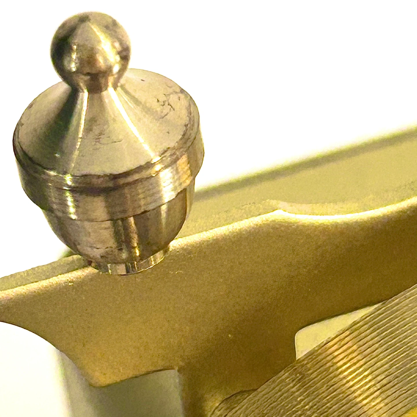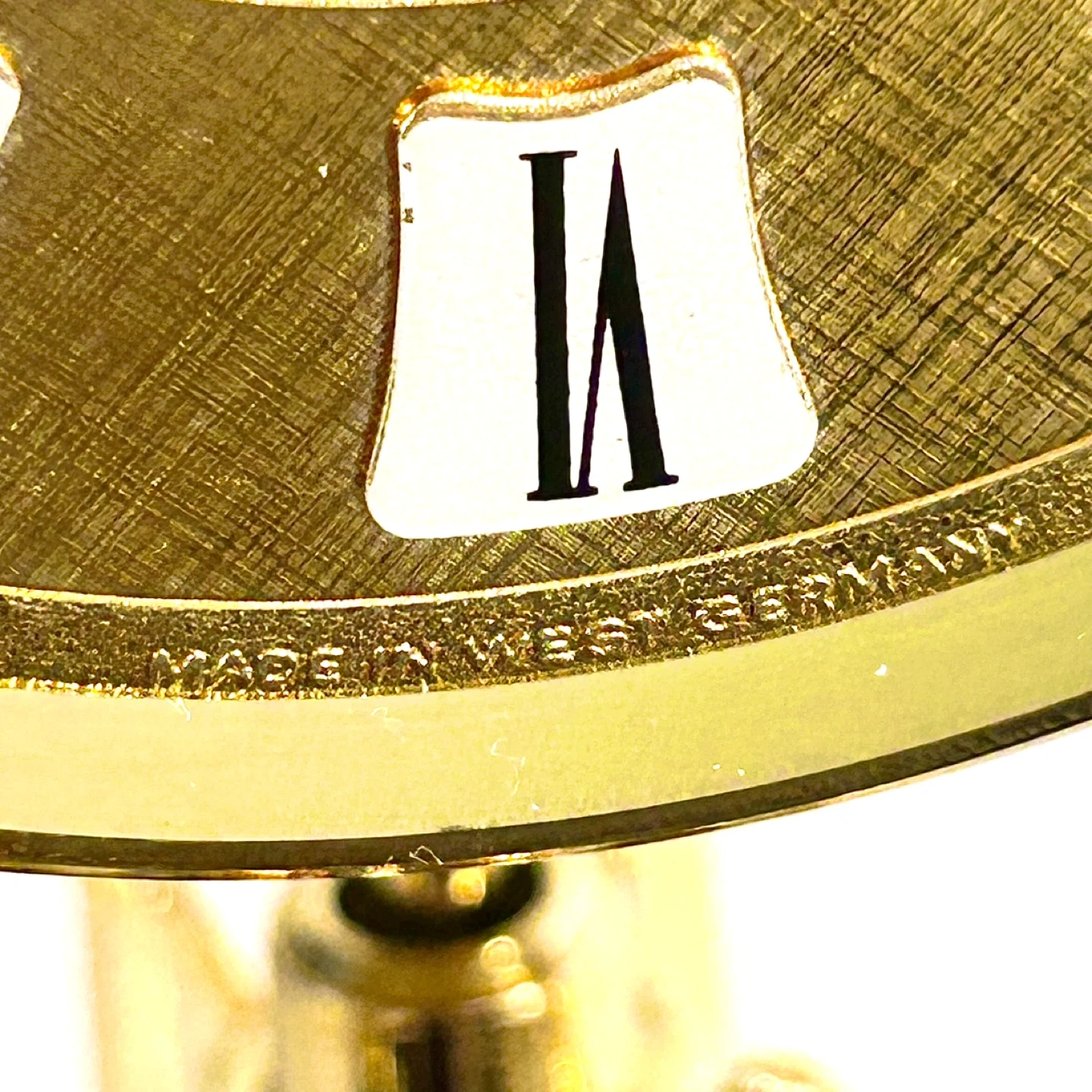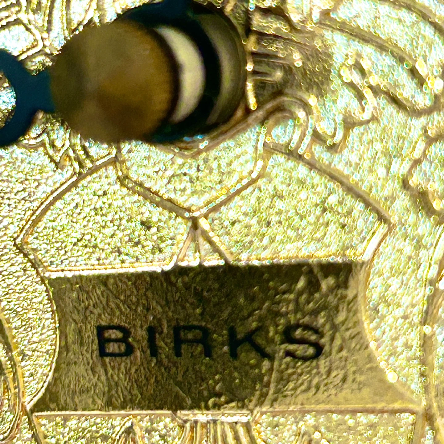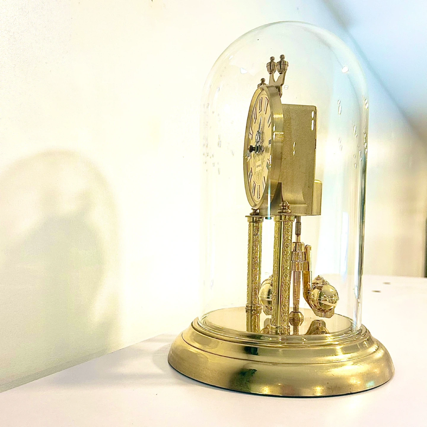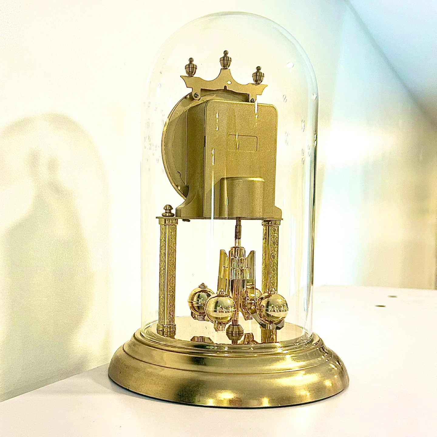 Vintage Birks anniversary clock, made in West Germany, complete with its original glass dome. This is an electro-mechanical torsion-style mantel clock with the classic rotating pendulum design. The brass casing, ornate columns, and Roman-numeral dial give it a strong collectible appeal. The Birks branding and “Made in West Germany” marks are intact and clearly visible.