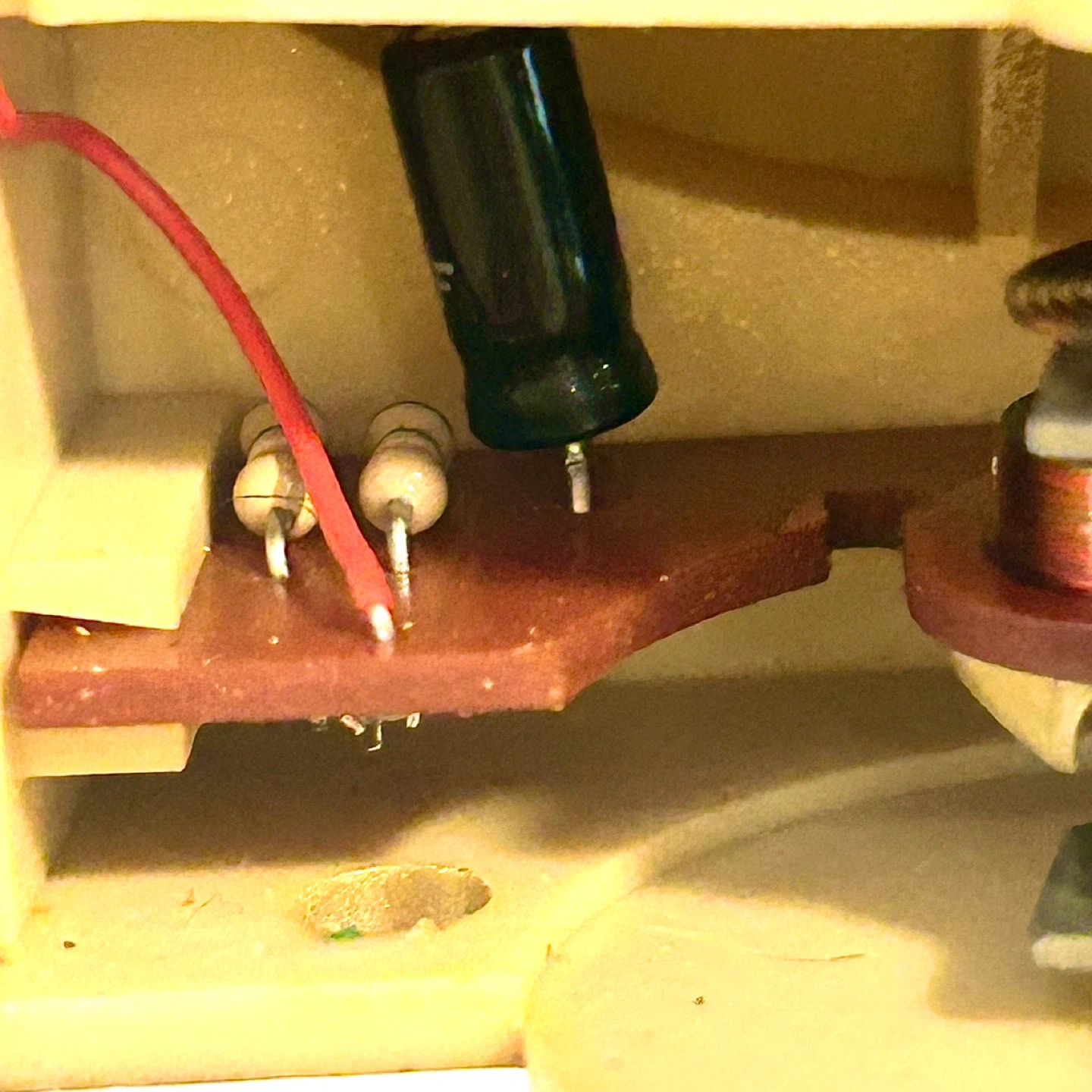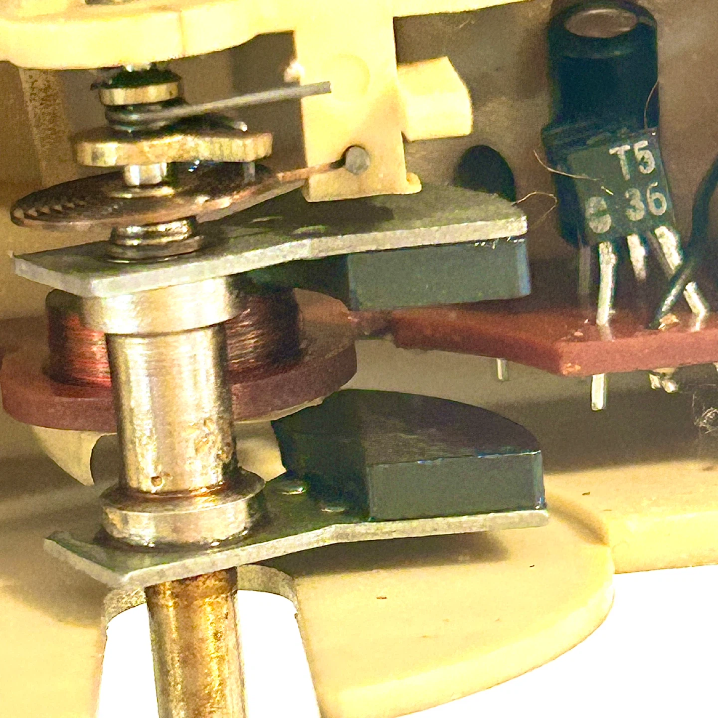 This model uses an early electro-mechanical movement rather than a traditional 400-day spring, which makes it lower-maintenance and more consistent than the purely mechanical variants. Internal components are clean and intact, with no corrosion on the visible circuitry or coils.
