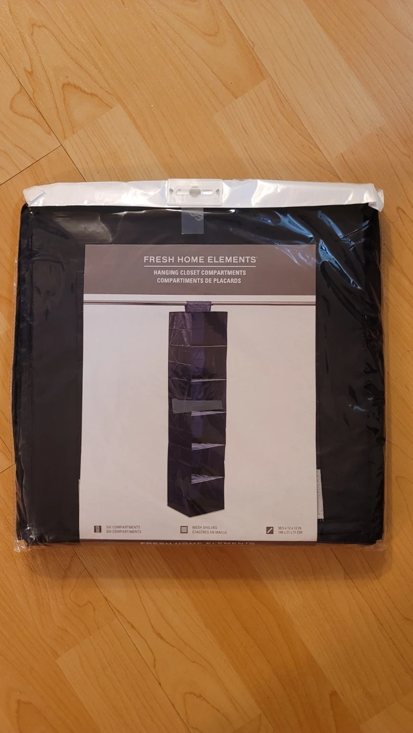 Brand new Fresh Home Elements hanging closet organizer still in its original packaging! It features six compartments and mesh shelves. The dimensions are 30.5 x 12 x 12 inches.