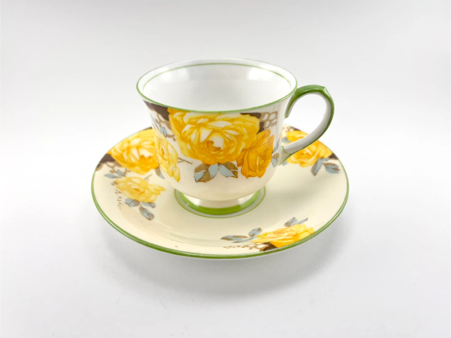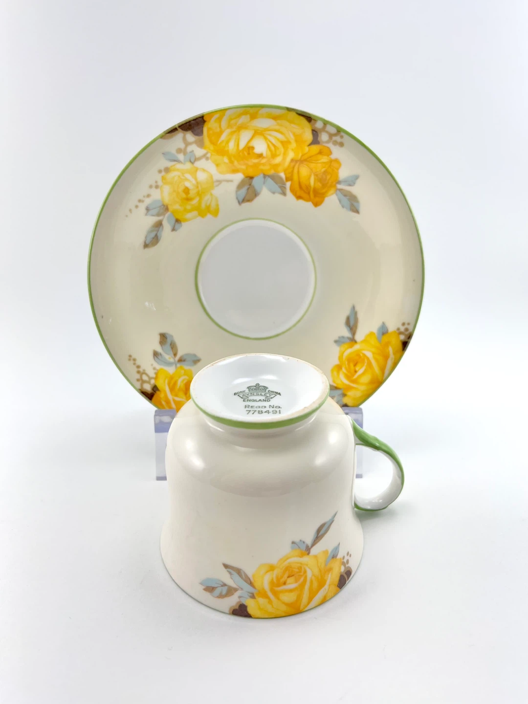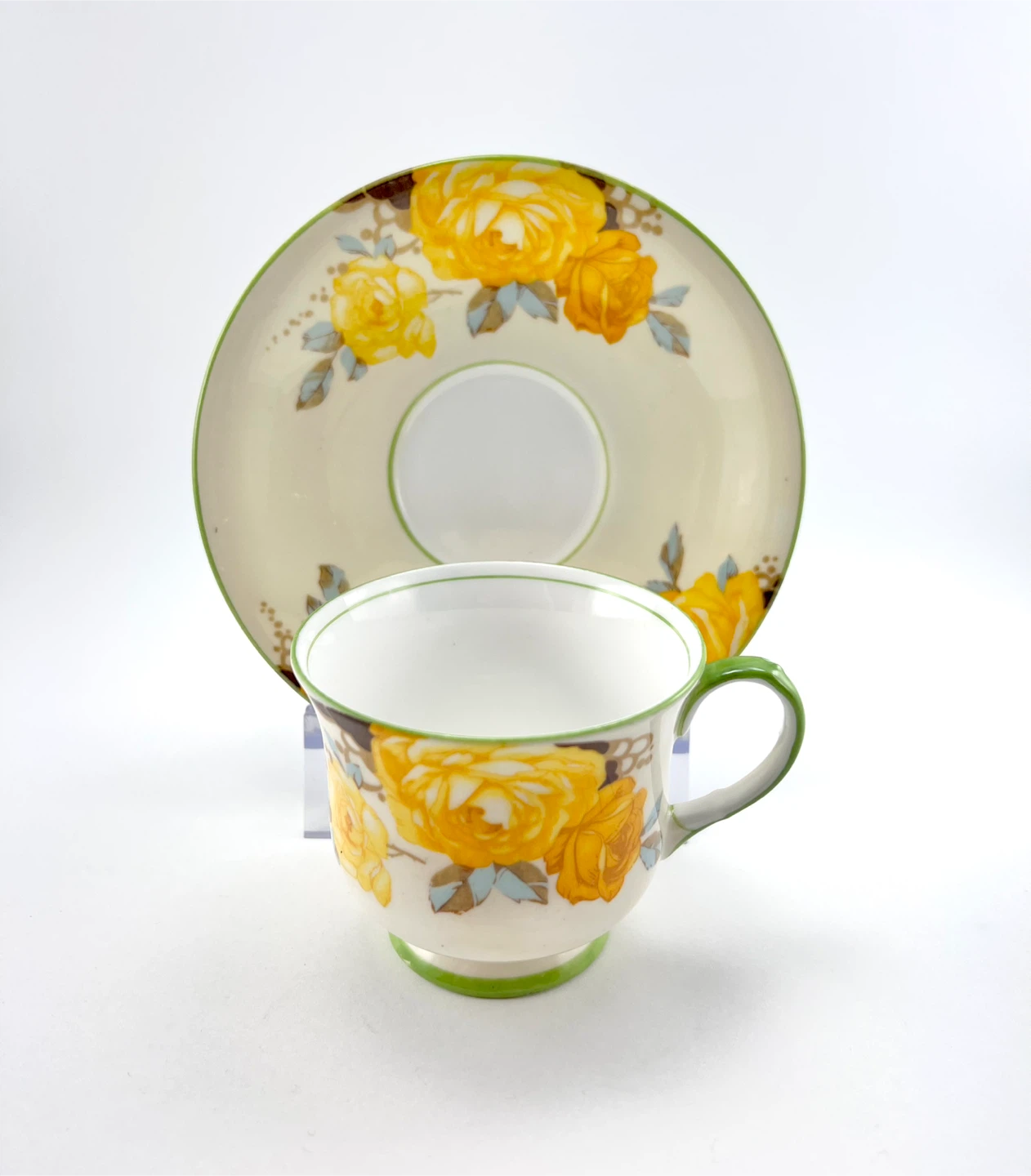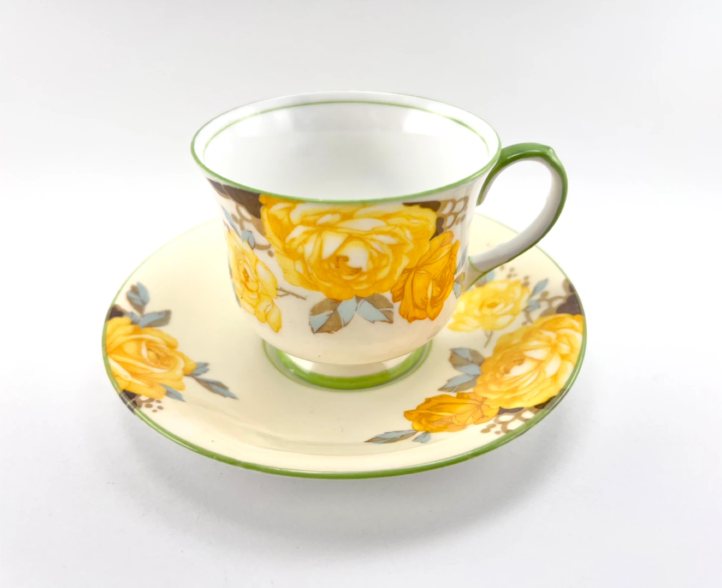 Vintage Aynsley fine bone cabinet china teacup featuring cream ground colour with large yellow cabbage roses & green rims/handle. No chips, cracks, crazing or gold loss — both pieces ping/ring