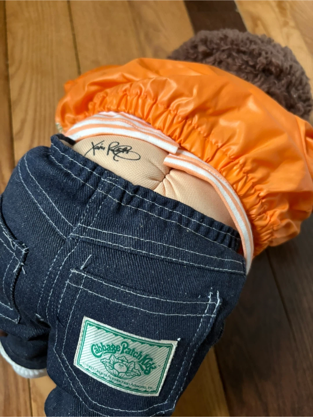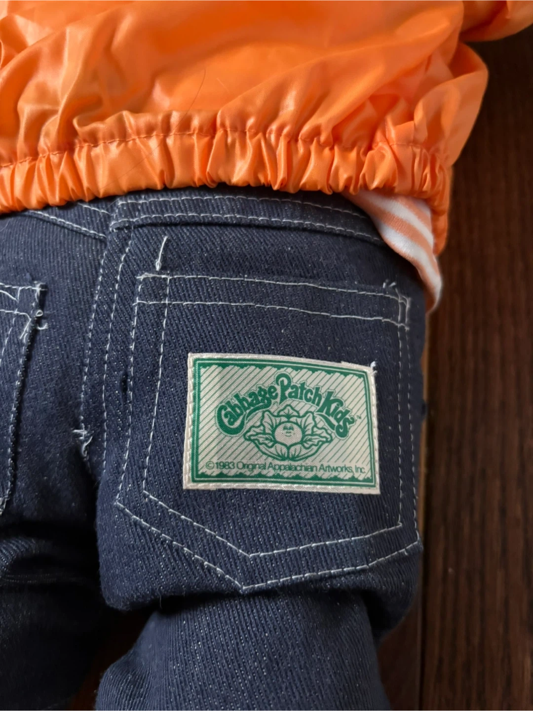 Here's a classic Cabbage Patch Kids doll looking for a new home! This doll has brown curly hair and blue eyes. It's wearing a cute orange jacket, a striped shirt, and denim pants with the Cabbage Patch Kids logo on the back pocket! Comes with original diaper and pair of socks! Super clean! Super rare!