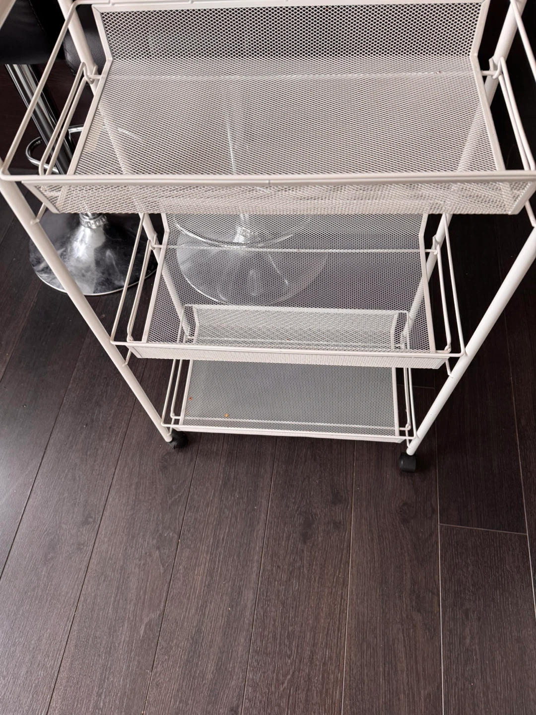 Selling a handy white rolling cart! It has three tiers, perfect for organizing your space. It's in great condition and ready to roll into your home