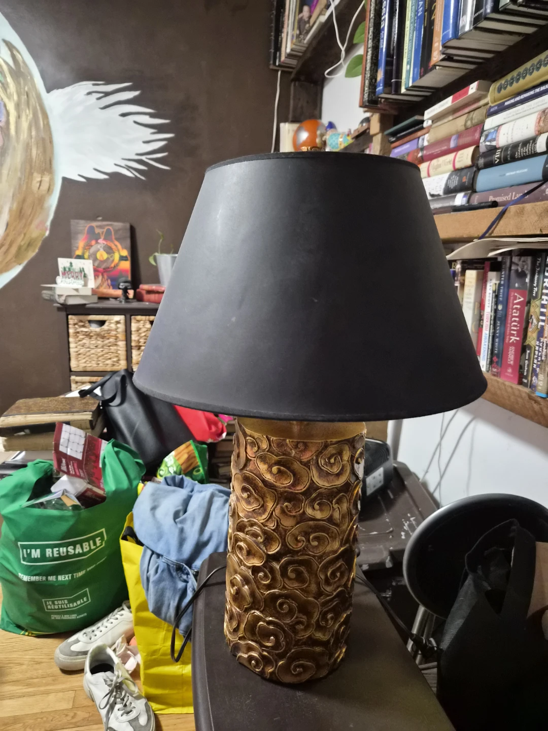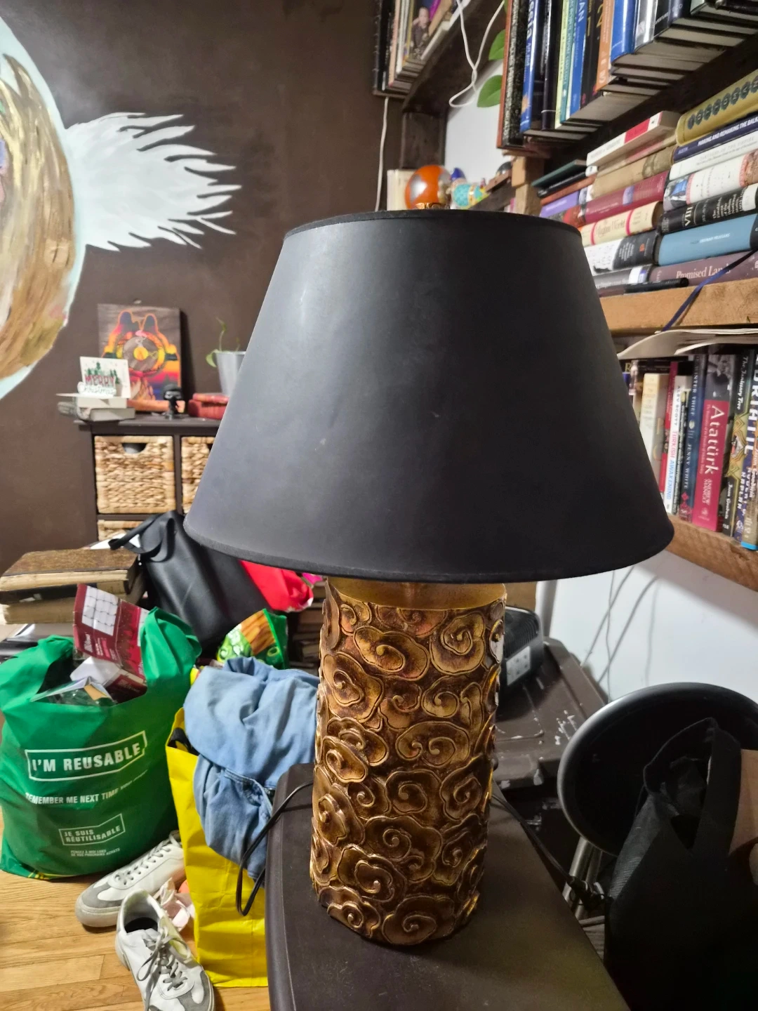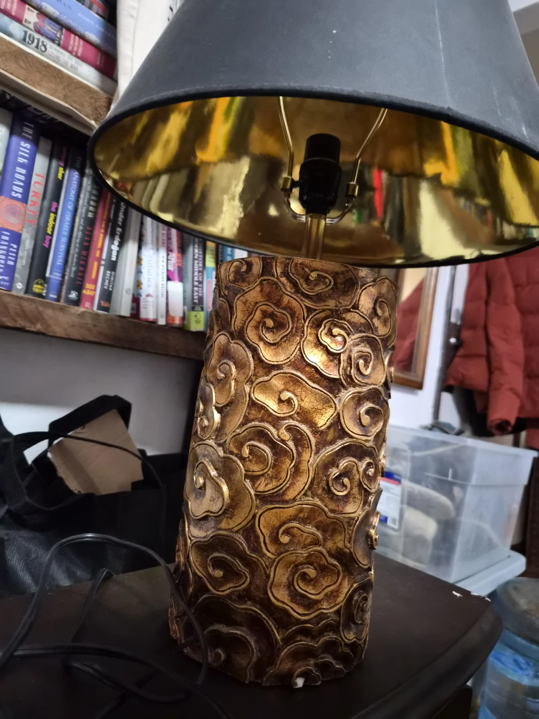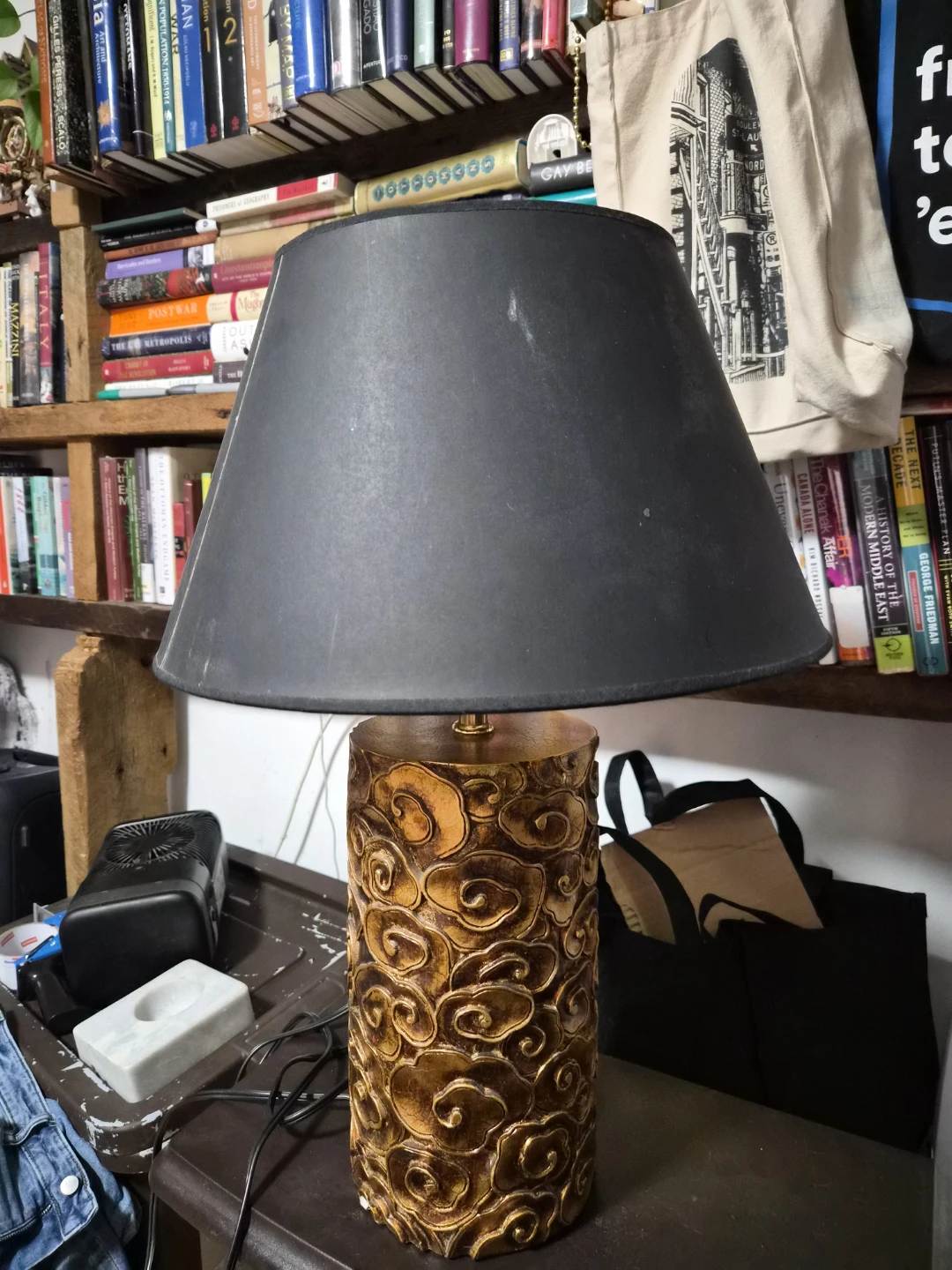 Giving away this decorative table lamp with a unique carved gold-textured base and black shade.