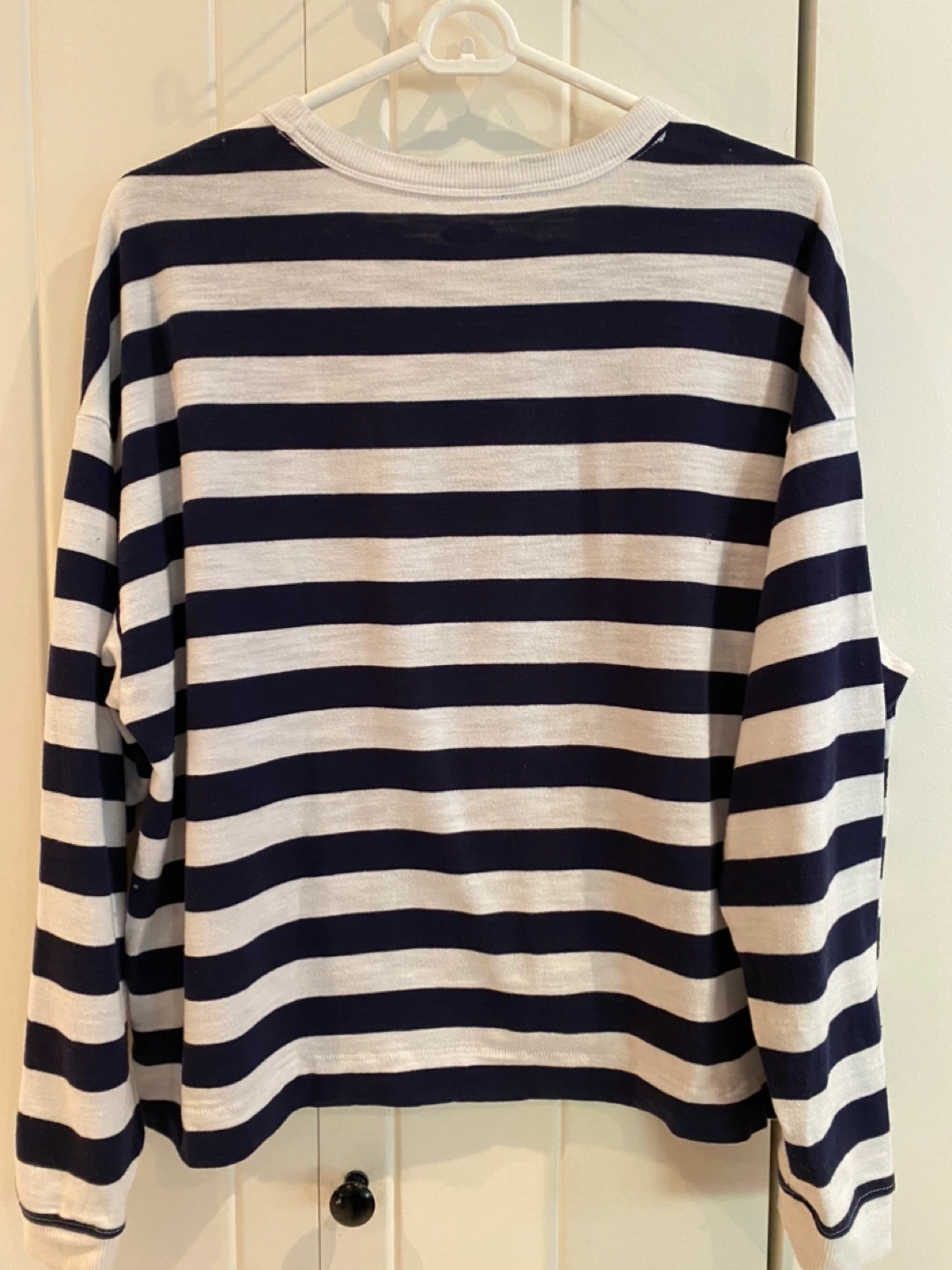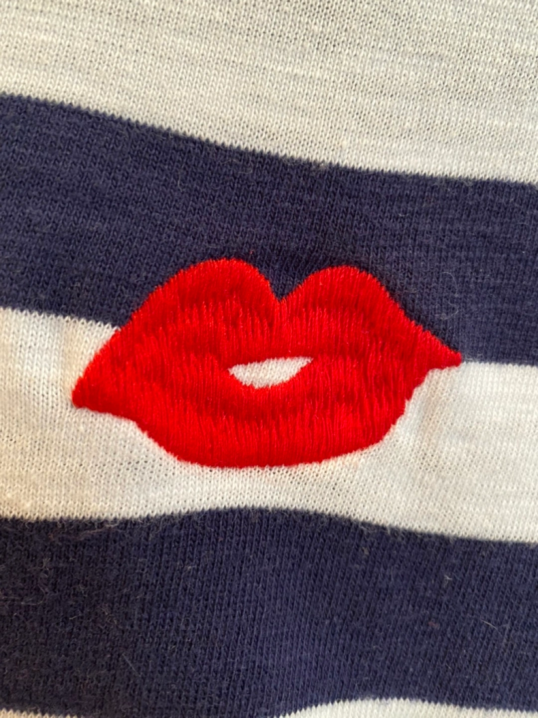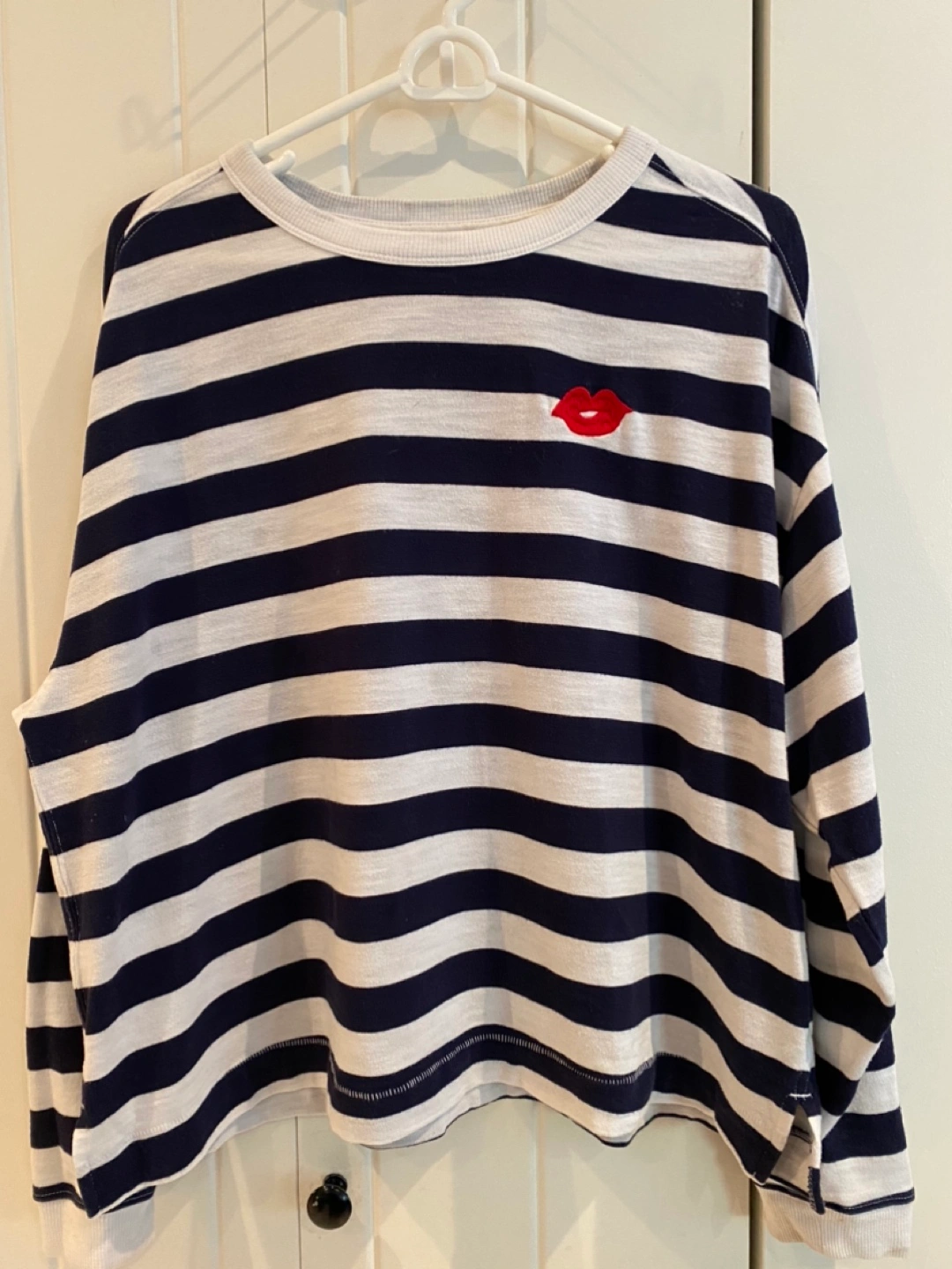 Size L. 60% cotton, 40% polyester. Medium weight knit fabric. Navy and white stripes with embroidered red lips on upper left chest. Crew neck, long drop sleeves. Straight boxy body with notched hem.