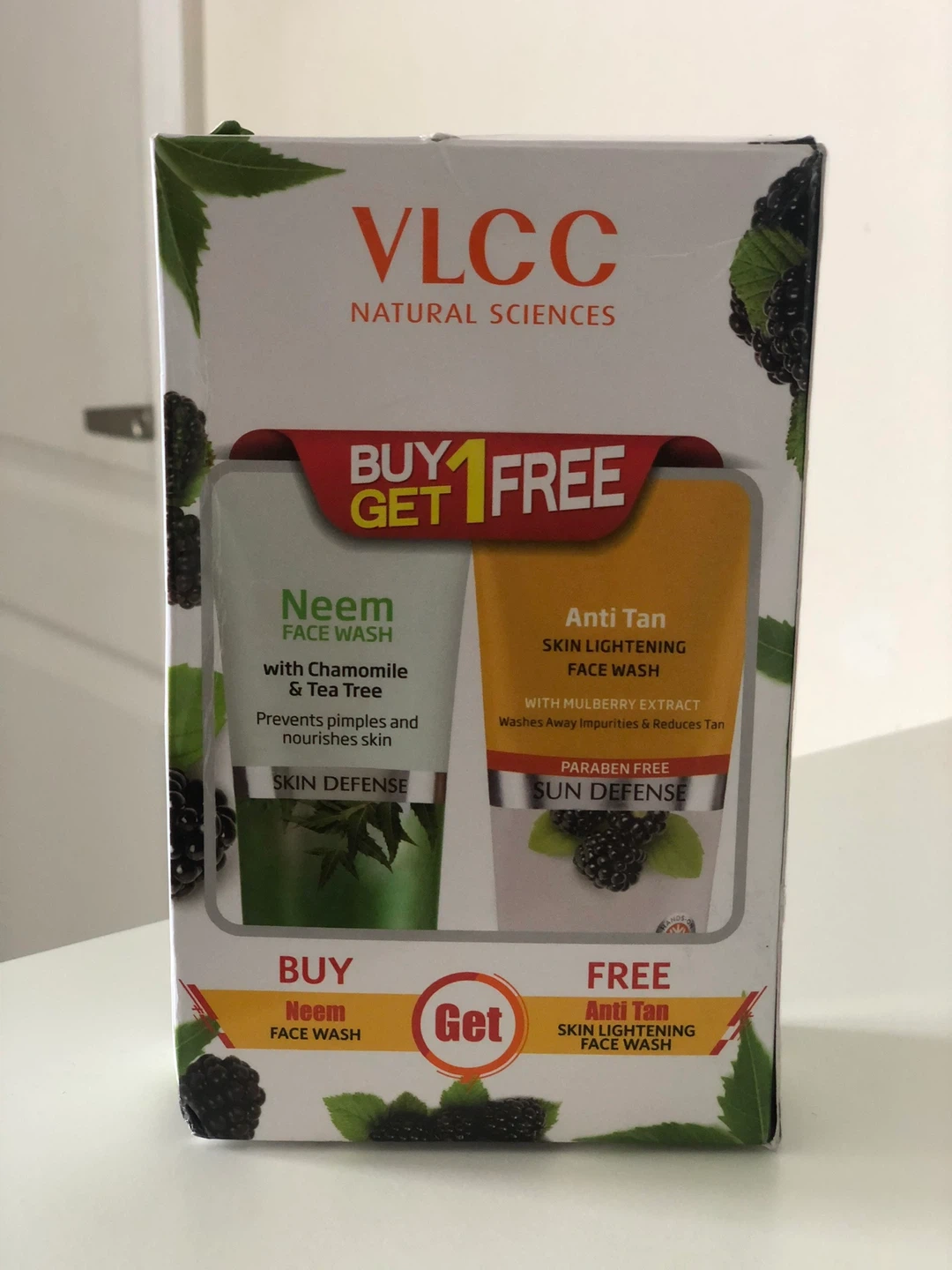Selling a VLCC Natural Sciences face wash set! It includes Neem Face Wash with Chamomile & Tea Tree, which prevents pimples and nourishes skin, and Anti Tan Skin Lightening Face Wash with Mulberry Extract, which washes away impurities and reduces tan.