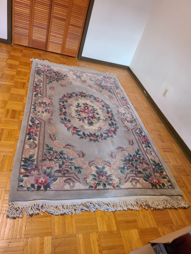 Beautiful floral detailed virgin wool rug. In great pre loved condition, just needs a steam cleaning and its good as new! 8' x 5' in size. Originally paid $1800