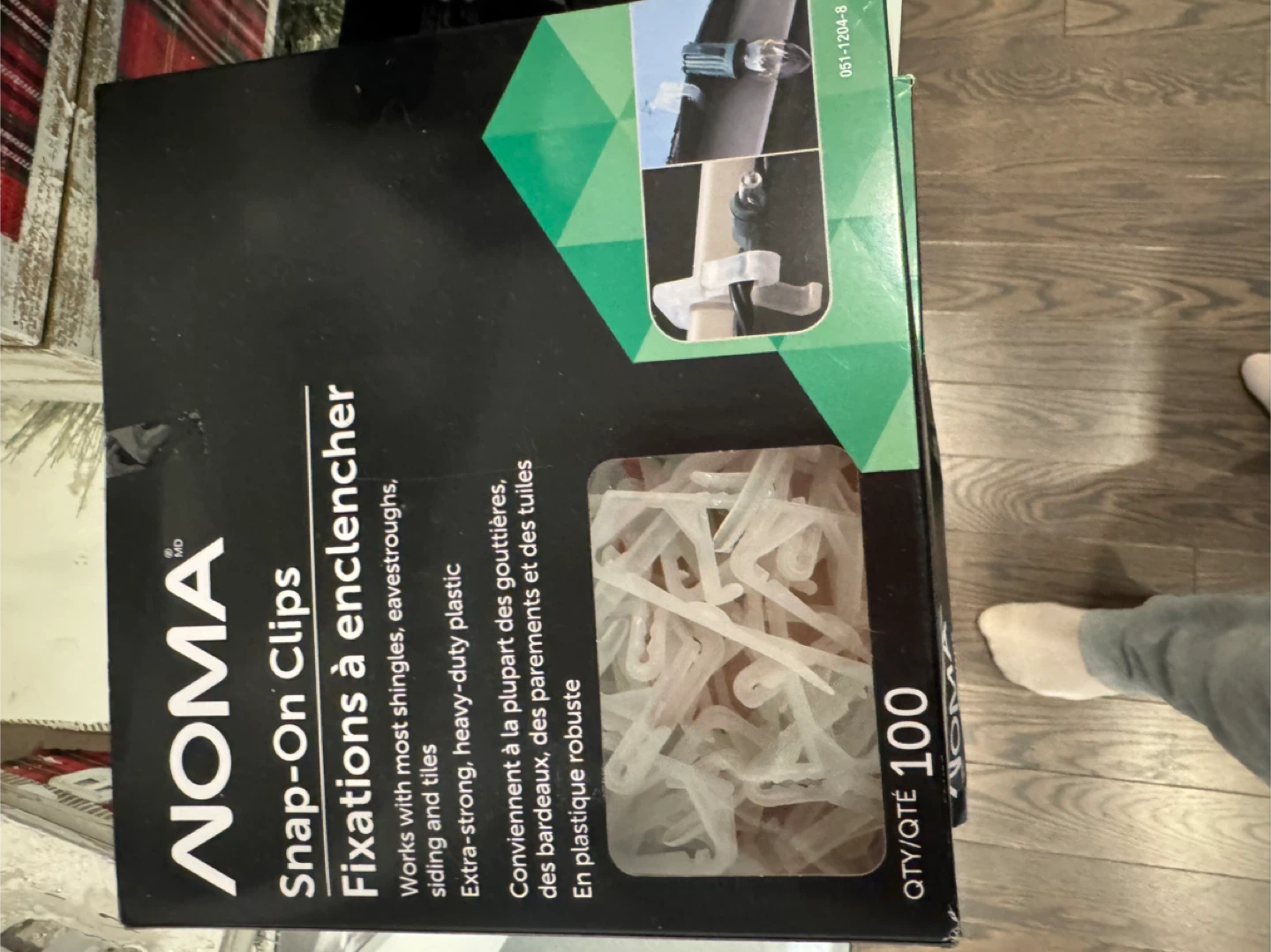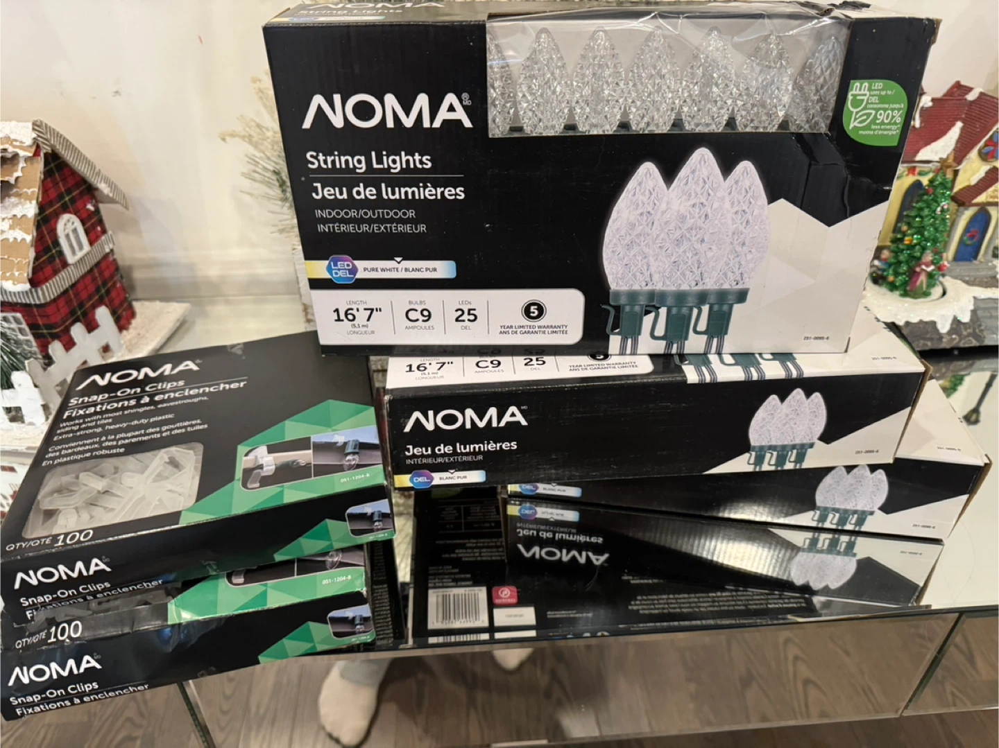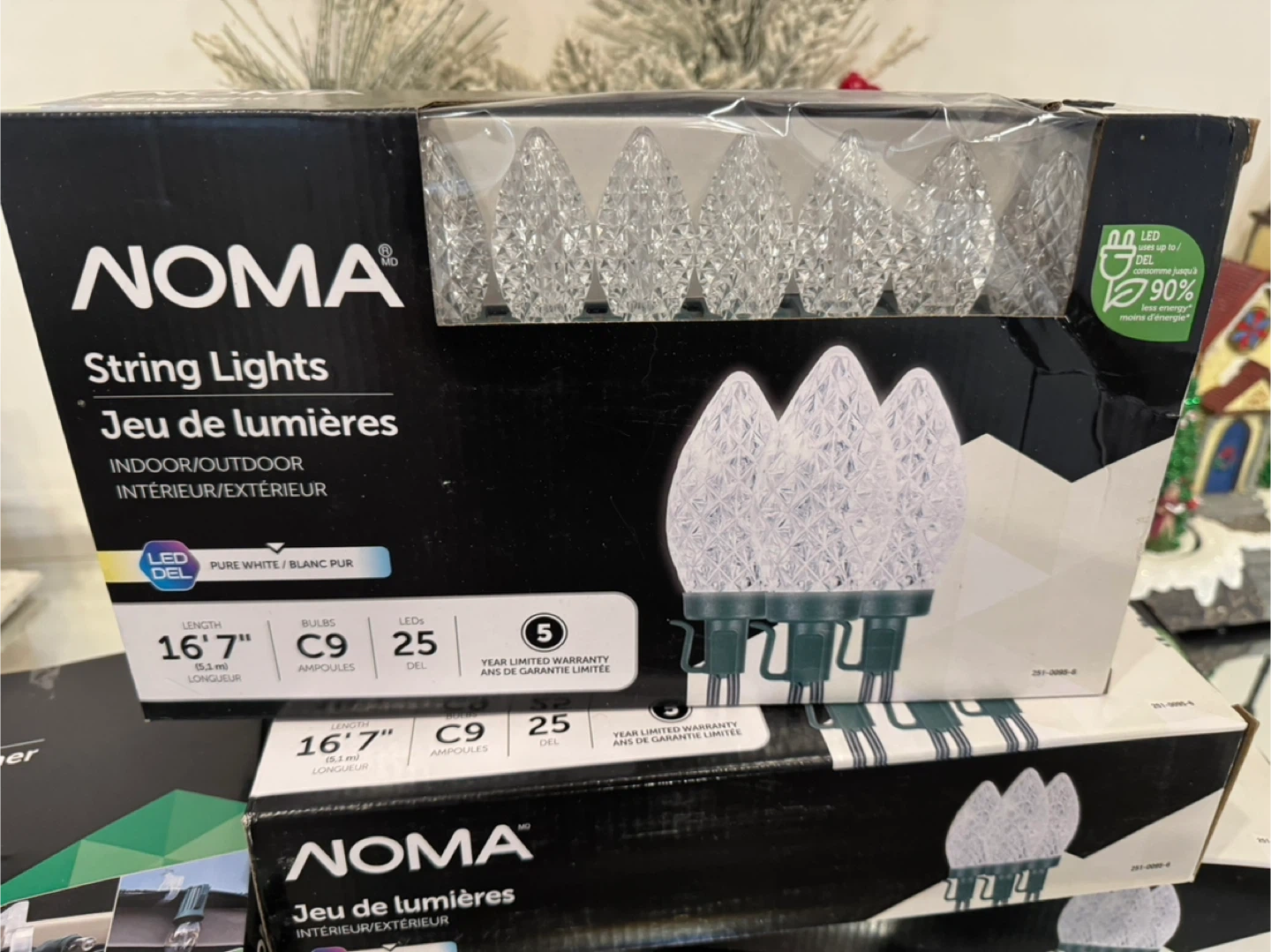 Selling NOMA string lights, perfect for indoor or outdoor use! These are pure white LED lights, 16'7" in length, with 25 C9 bulbs. Also included are NOMA Snap-On Clips for easy installation. Great for adding a festive touch to your home! take all for 50$