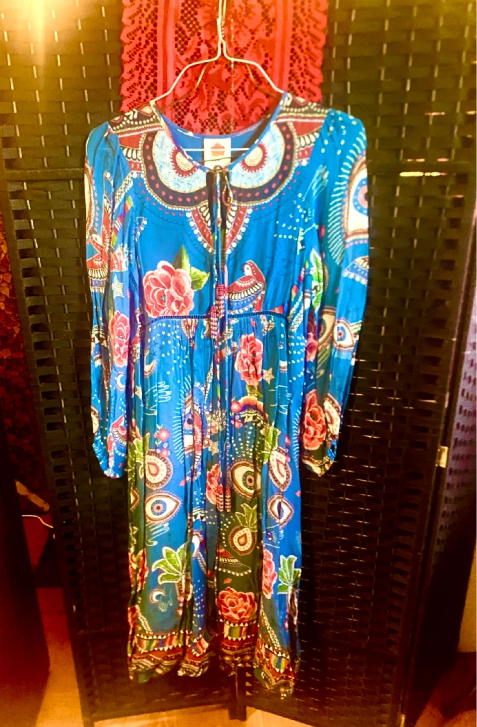 This is a beautiful blue dress with a vibrant floral pattern. It's a long-sleeved dress, perfect for transitioning between seasons. The dress features a unique and eye-catching design. It would be a great addition to your wardrobe!