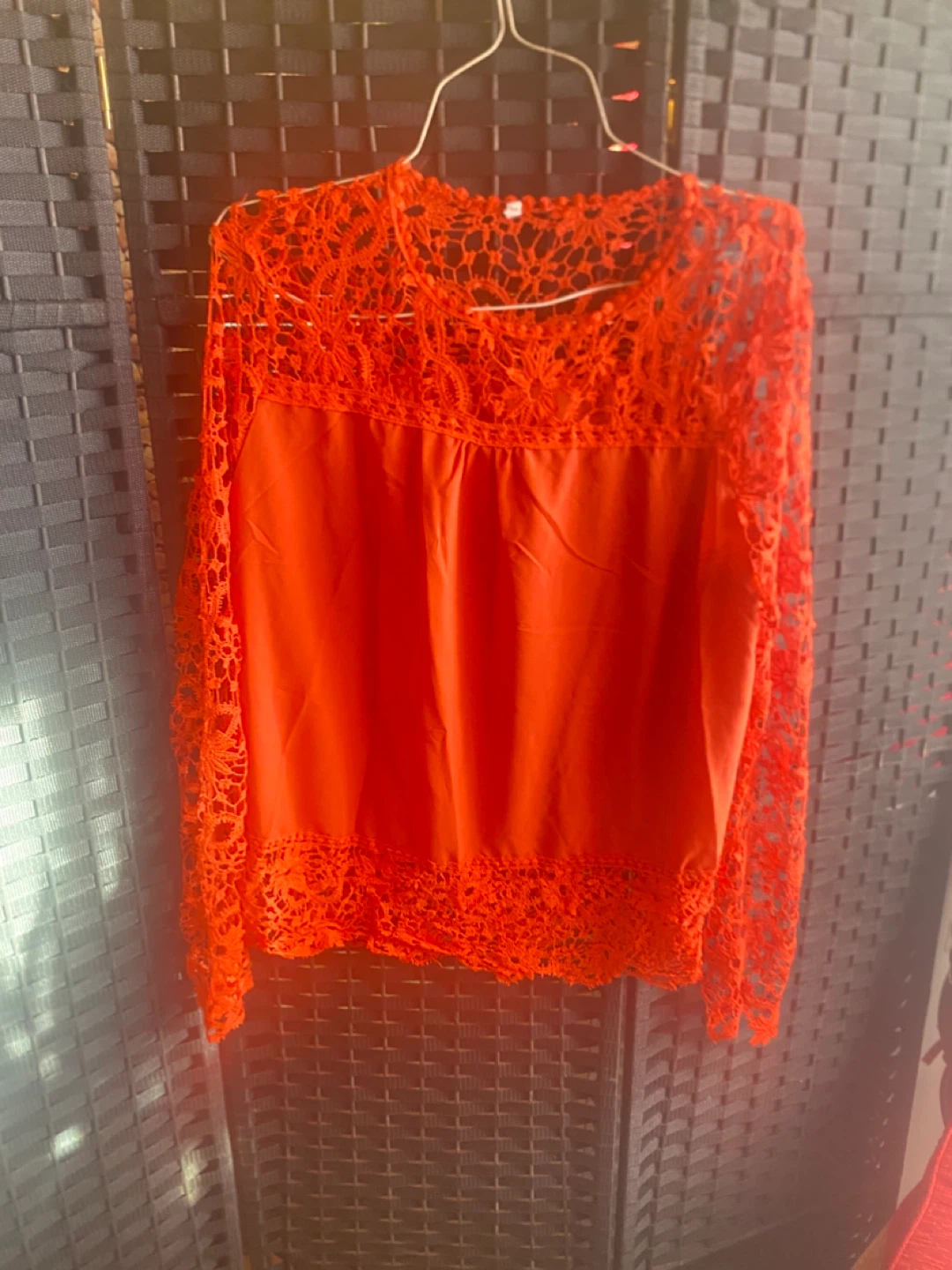 This is a beautiful red lace long sleeve blouse. It's in great condition and ready for a new home! The lace detailing is really pretty and adds a nice touch. It's perfect for dressing up or down, so it's super versatile