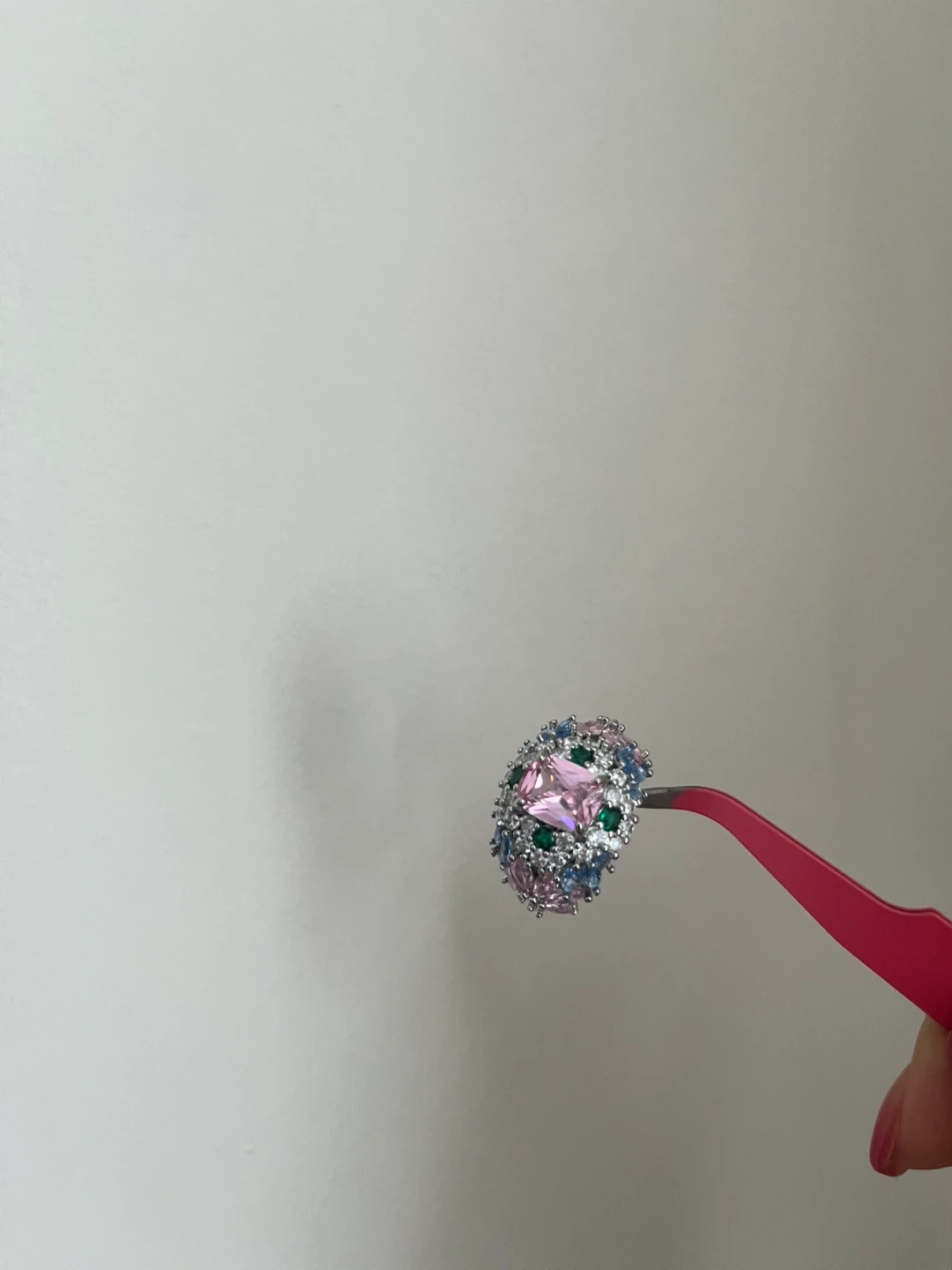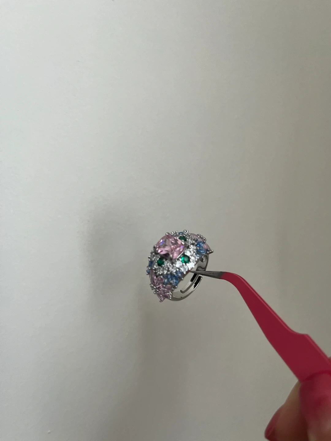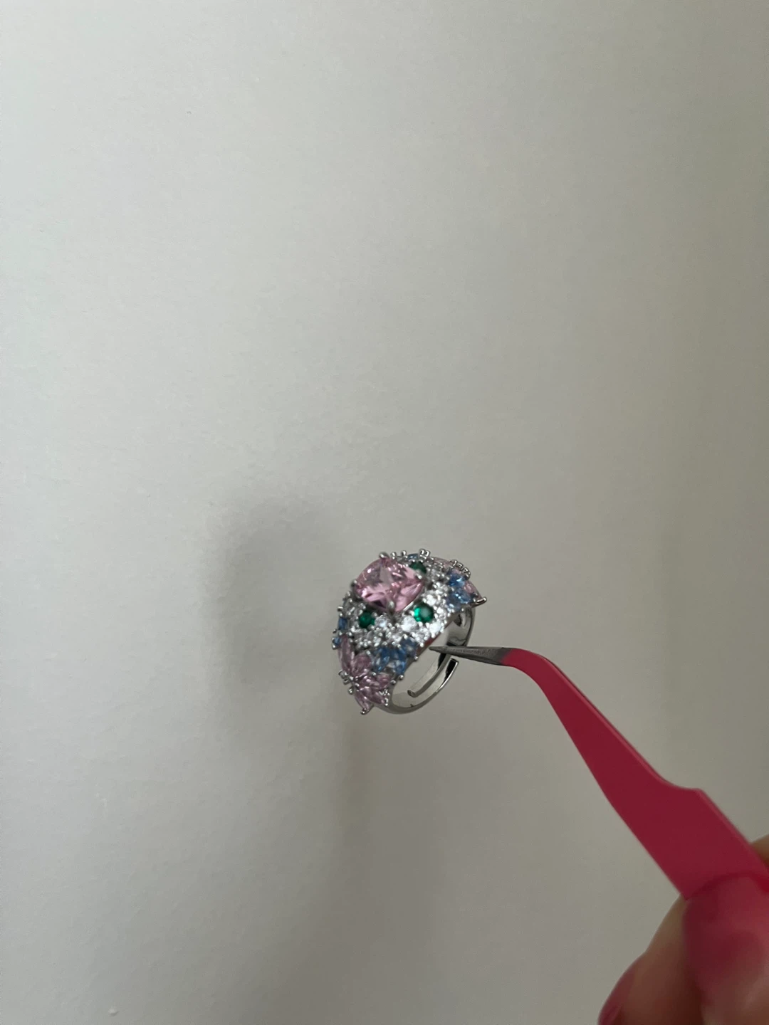 Selling a beautiful ring with colourful gemstones! It features pink, green, and blue stones set in a silver-tone band. It's in great condition and ready to add some sparkle to your collection