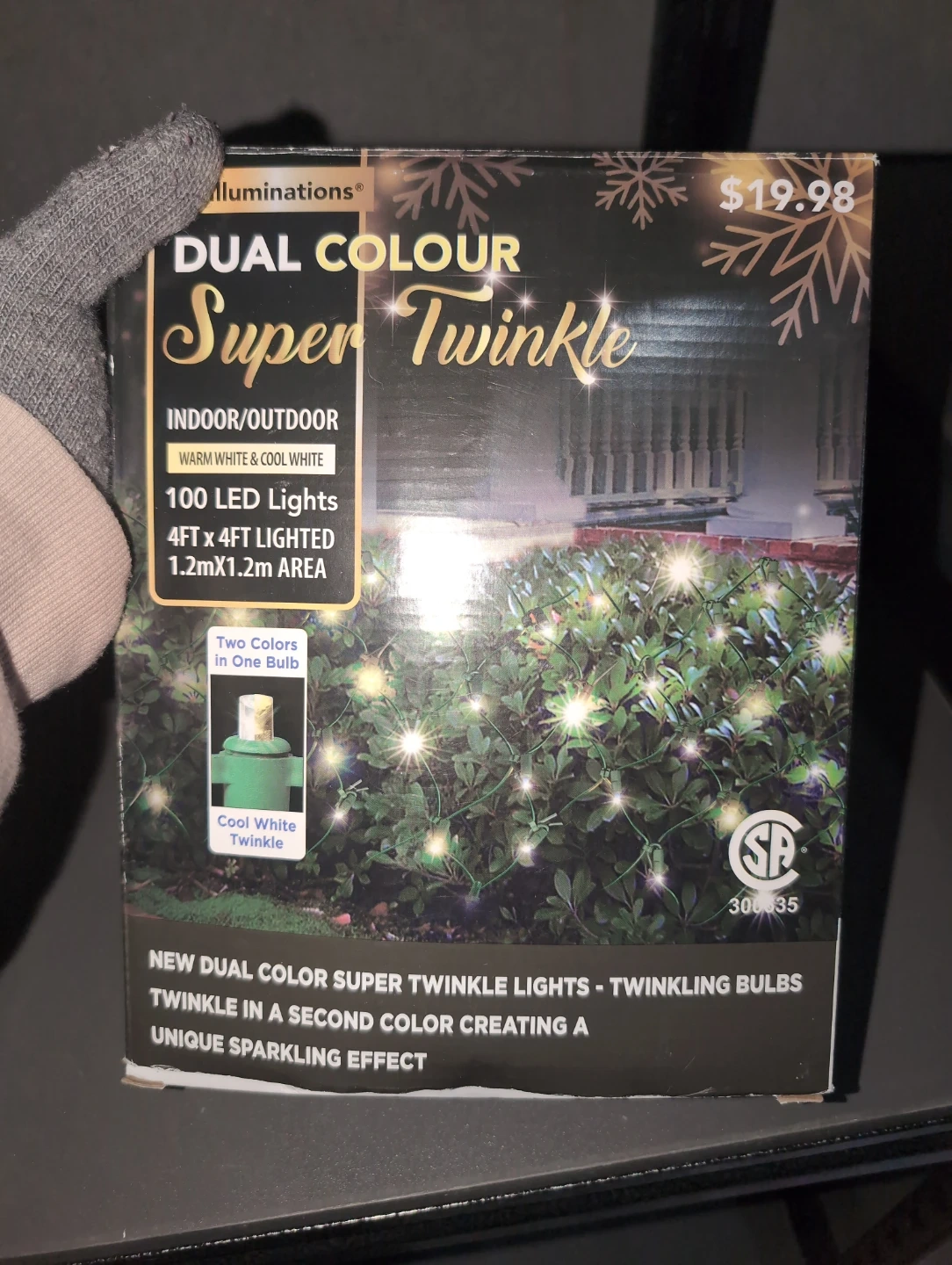 I'm selling a box of Illuminations Dual Colour Super Twinkle Lights. These lights are suitable for both indoor and outdoor use, featuring warm white and cool white options. They have 100 LED lights and cover a 4ft x 4ft lighted area (1.2m x 1.2m). They create a unique sparkling effect with twinkling bulbs.