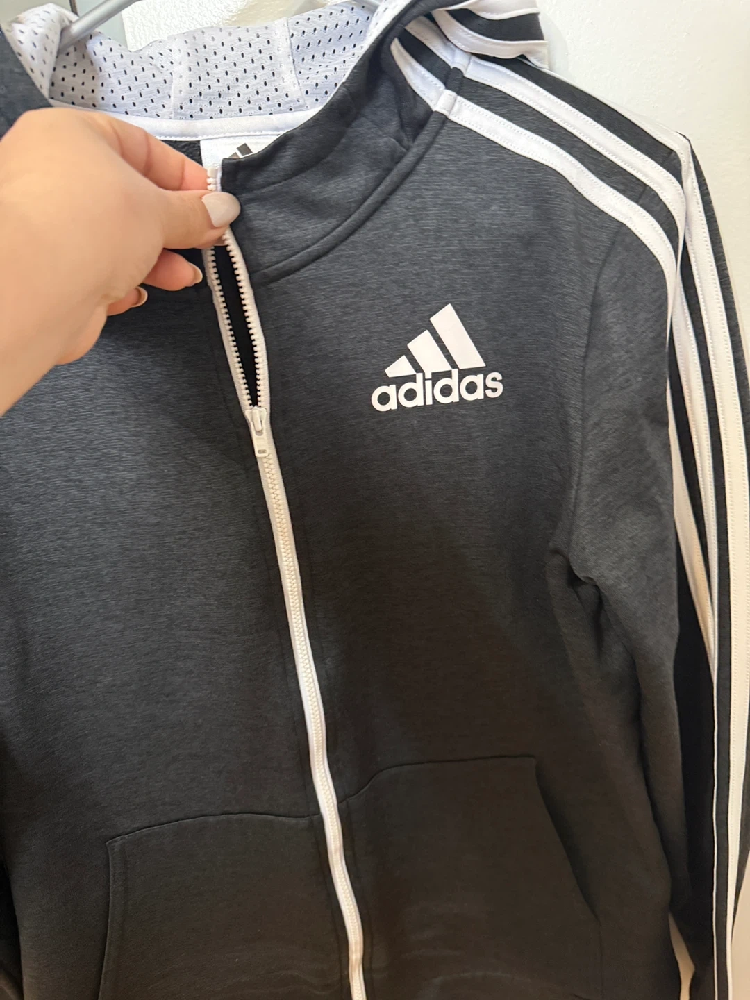Selling an Adidas track jacket in size S (18/20). It's a stylish black colour with the classic Adidas stripes. Great for sports or casual wear, size S in adult sizes