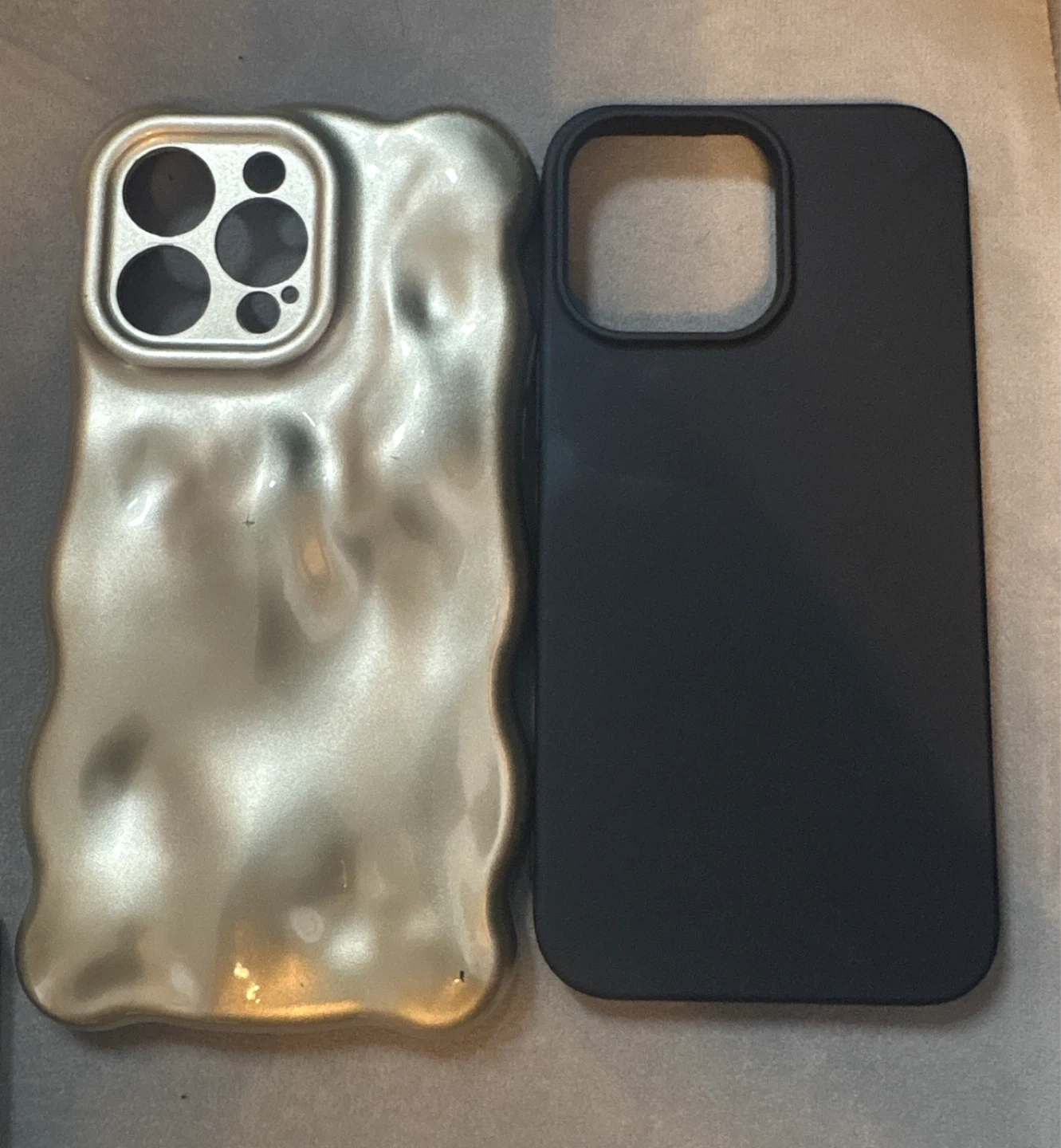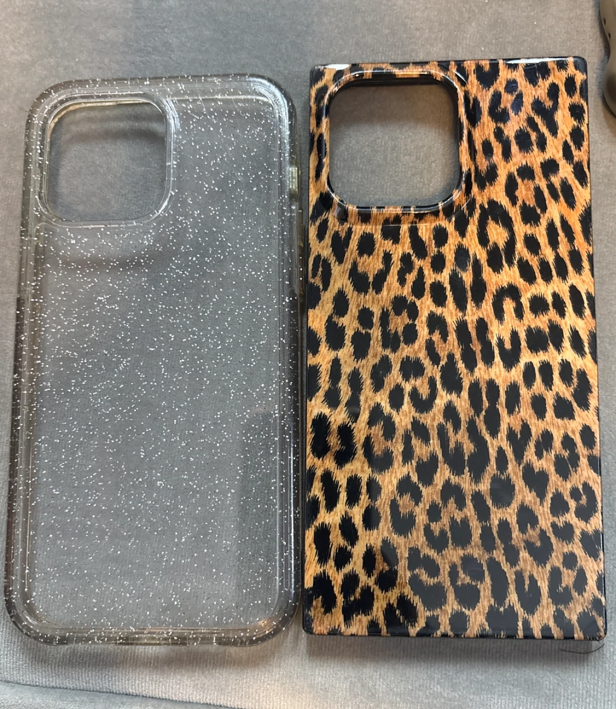 Selling a set of iPhone cases in great condition! There's a leopard print case, a glittery clear case, a gold textured case, and a simple black case. They're perfect for switching up your phone's look!