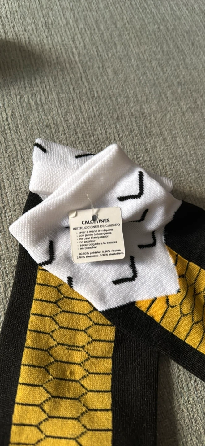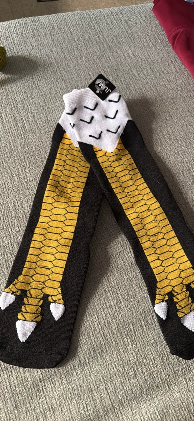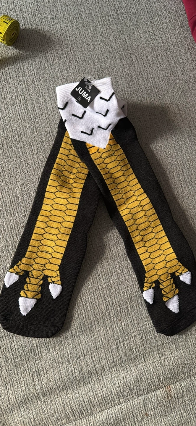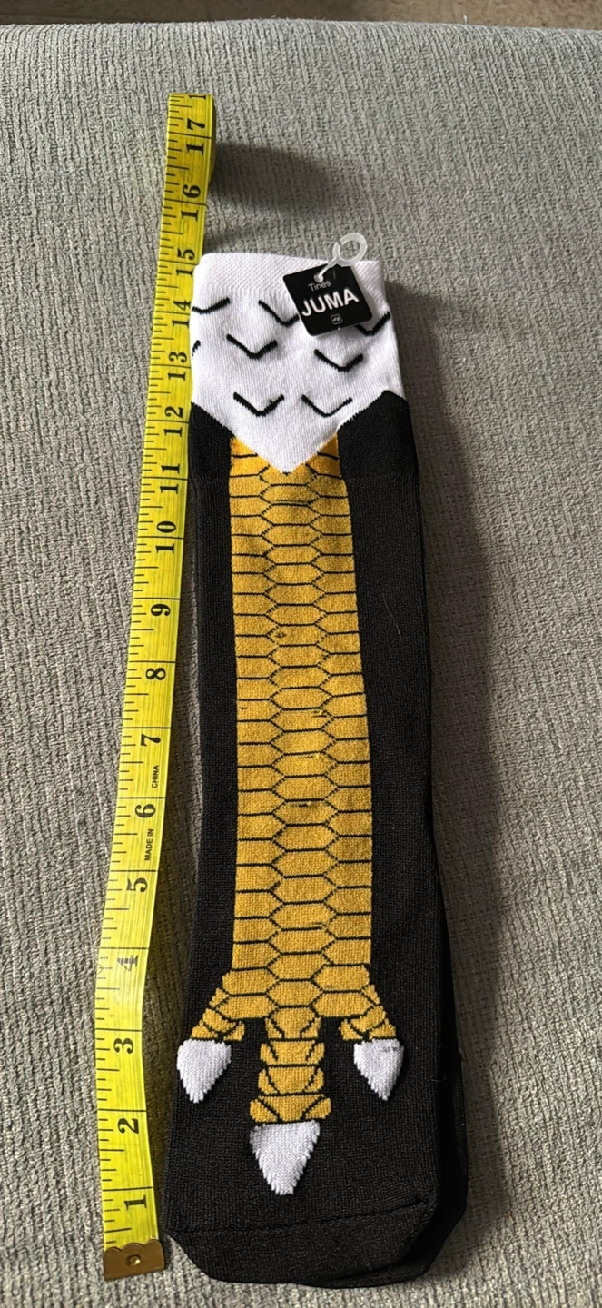 Selling a pair of Juma novelty socks designed to look like chicken legs! They are black and yellow with white accents. The socks are approximately 16 inches long and made of 90% polyester and 10% elastane