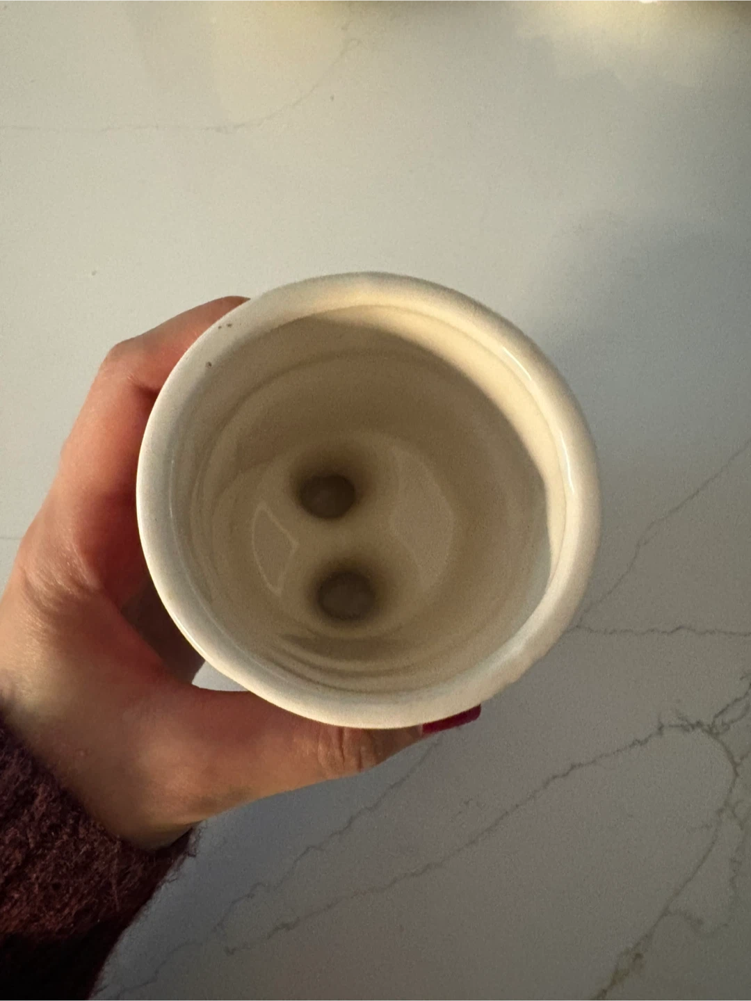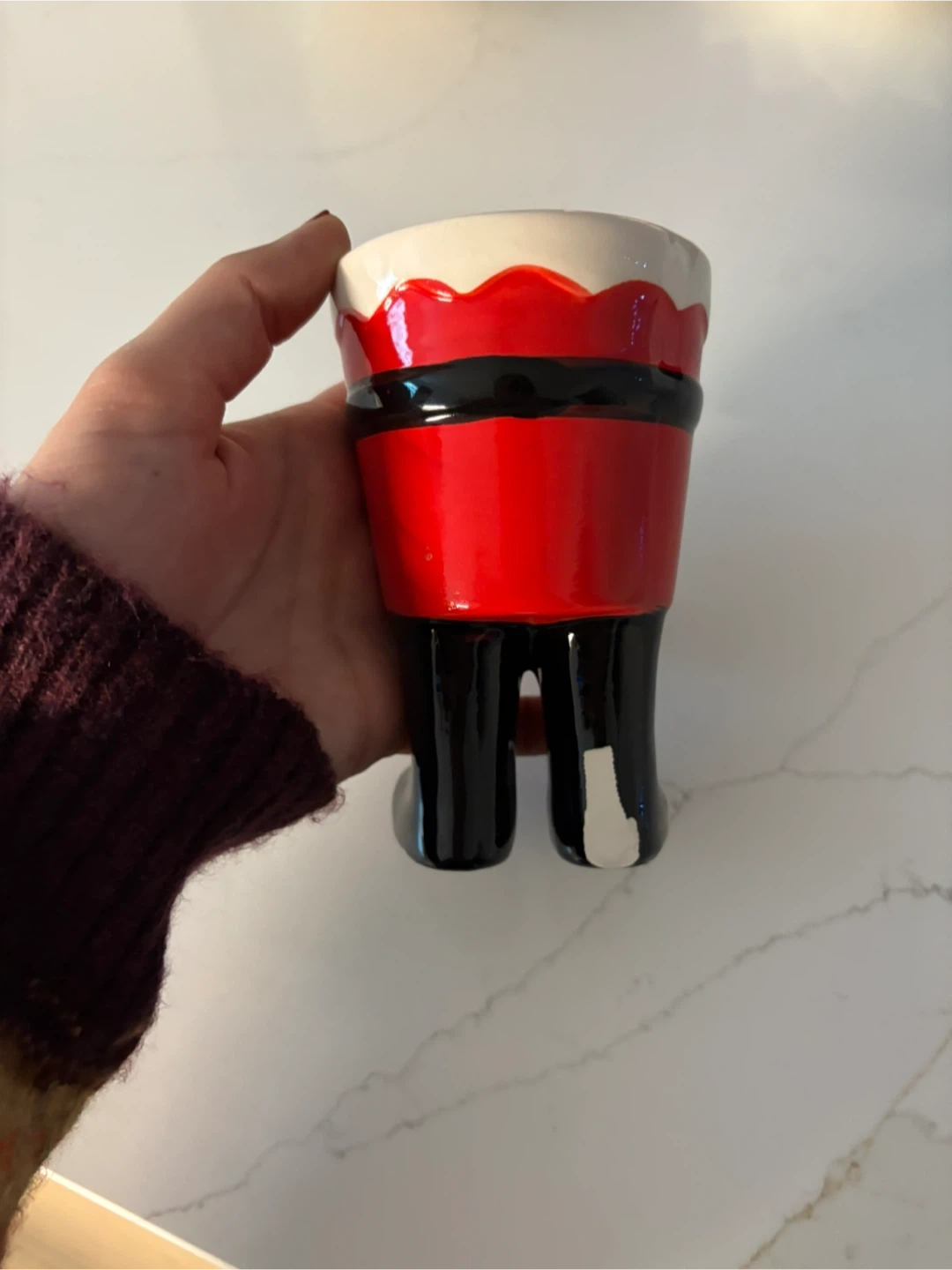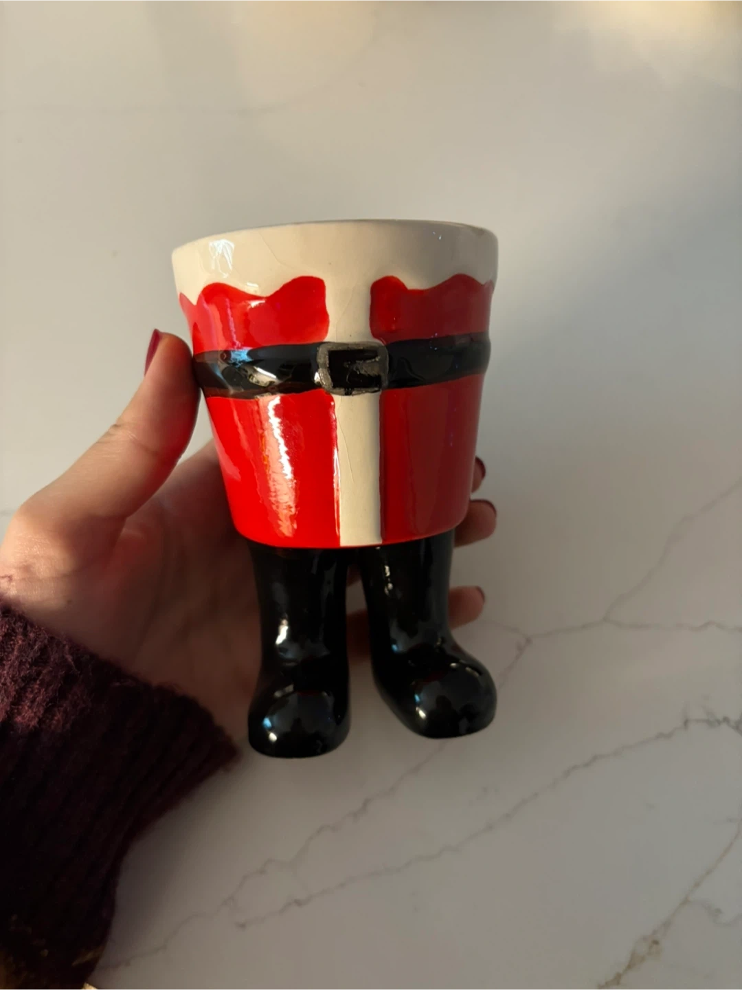 ceramic planter shaped like Santa's legs and outfit. Small chip in the back of one of Santa boots.