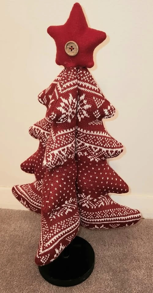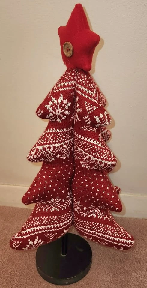 • Red Knit Fabric Tree (19" tall): Scandinavian-inspired with white snowflake patterns, tiered design, and a button-accented star topper. Stands on a sturdy black wooden base. Reminds me of a Nordic or Fair Isle sweater pattern
