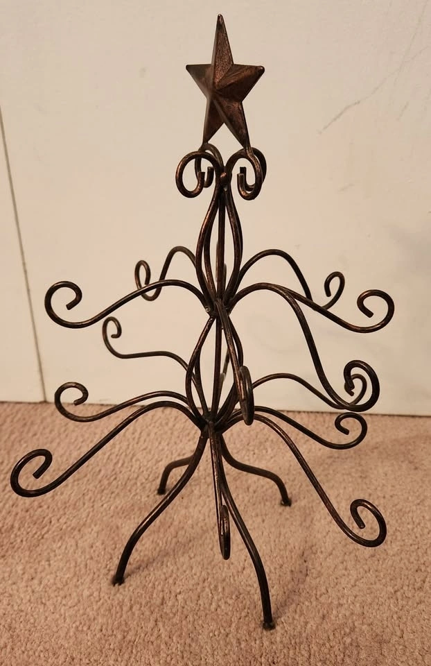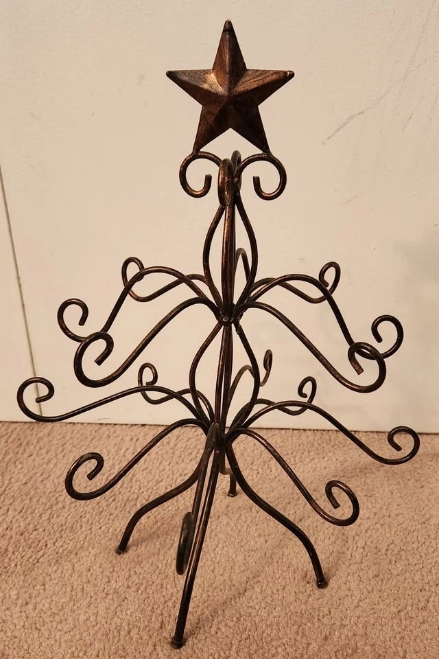 • Black Metal Scroll Tree (13" tall): Elegant wrought-iron style with swirling branches and a star top. Great as a standalone piece or display with small ornaments.